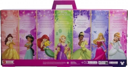 Deze uitgebreide set brengt geliefde heldinnen samen: ARIEL, AURORA, BELLE, ASSEPOESTER, JASMINE, RAPUNZEL en TIANA. Elke pop valt op door karakteristieke details geïnspireerd op de films, glinsterende stoffen en elegante accessoires. Verschillende pophoogtes en bewegende armen en benen maken eenvoudig poseren en het vertellen van eigen verhalen mogelijk.
