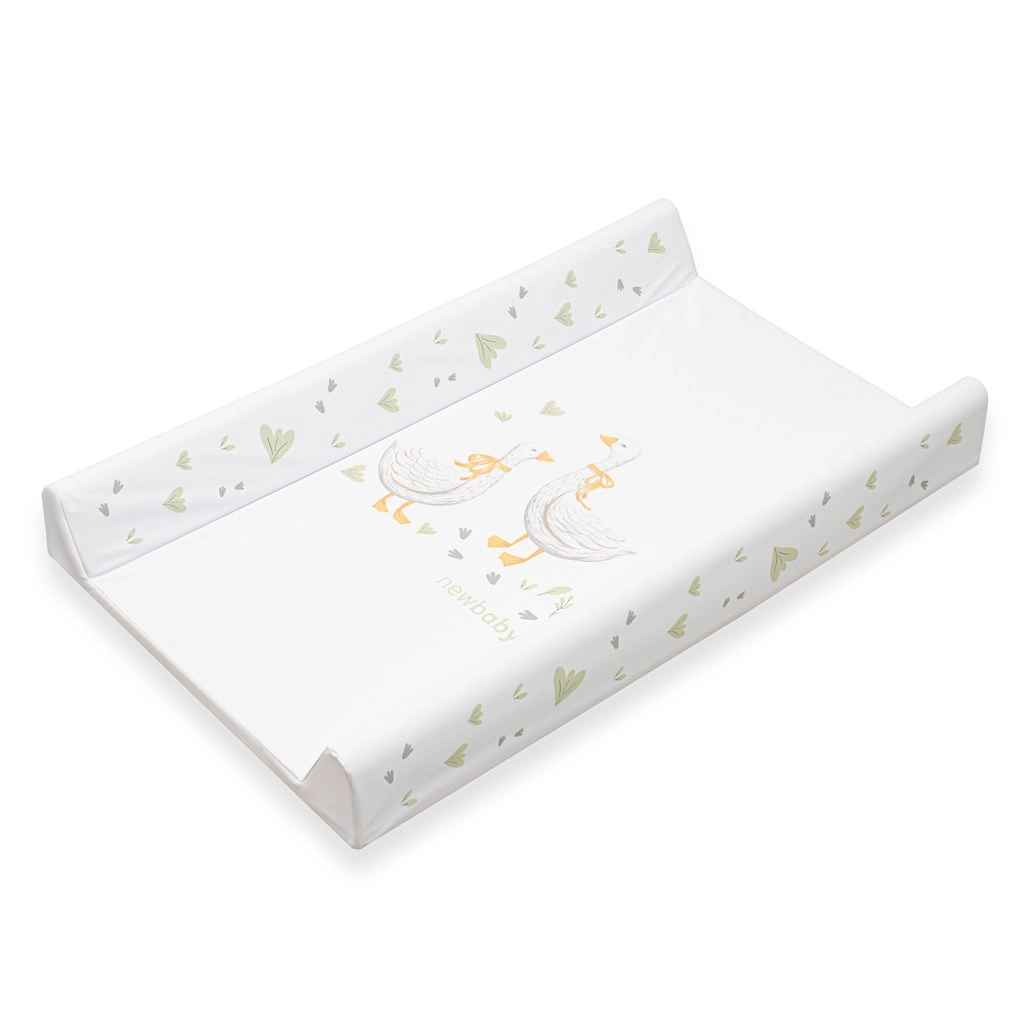Praktisch gevormd aankleedblad NEW BABY met gansjesmotief, gemaakt van duurzaam, eenvoudig afwasbaar plastic. Dankzij de verhoogde zijkanten en de stevige bodemplaat biedt het veilig en comfortabel verschonen. Zachte pastelkleuren en een schattig dessin trekken de aandacht van de baby, terwijl ouders het waterdichte oppervlak en de eenvoudige verzorging waarderen.