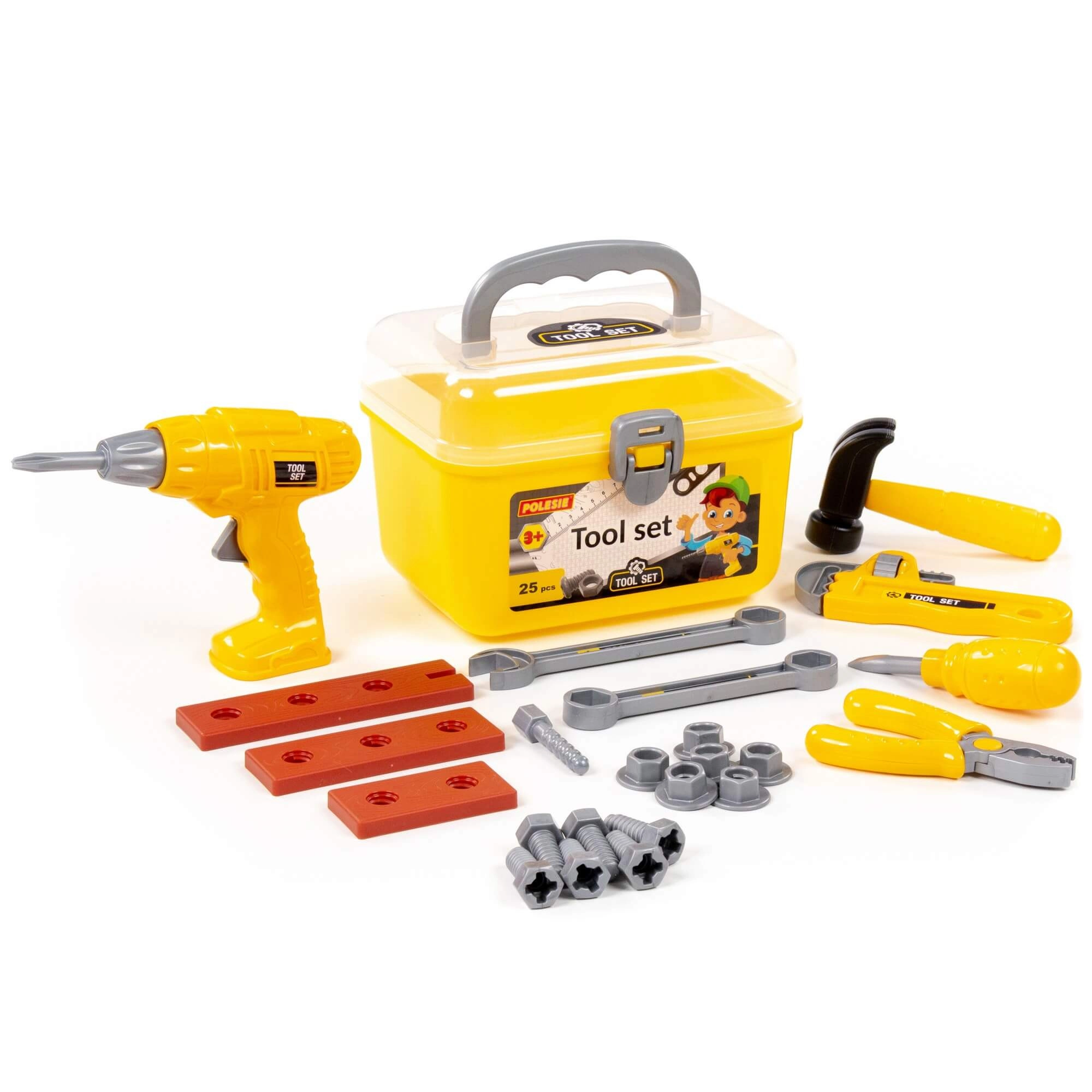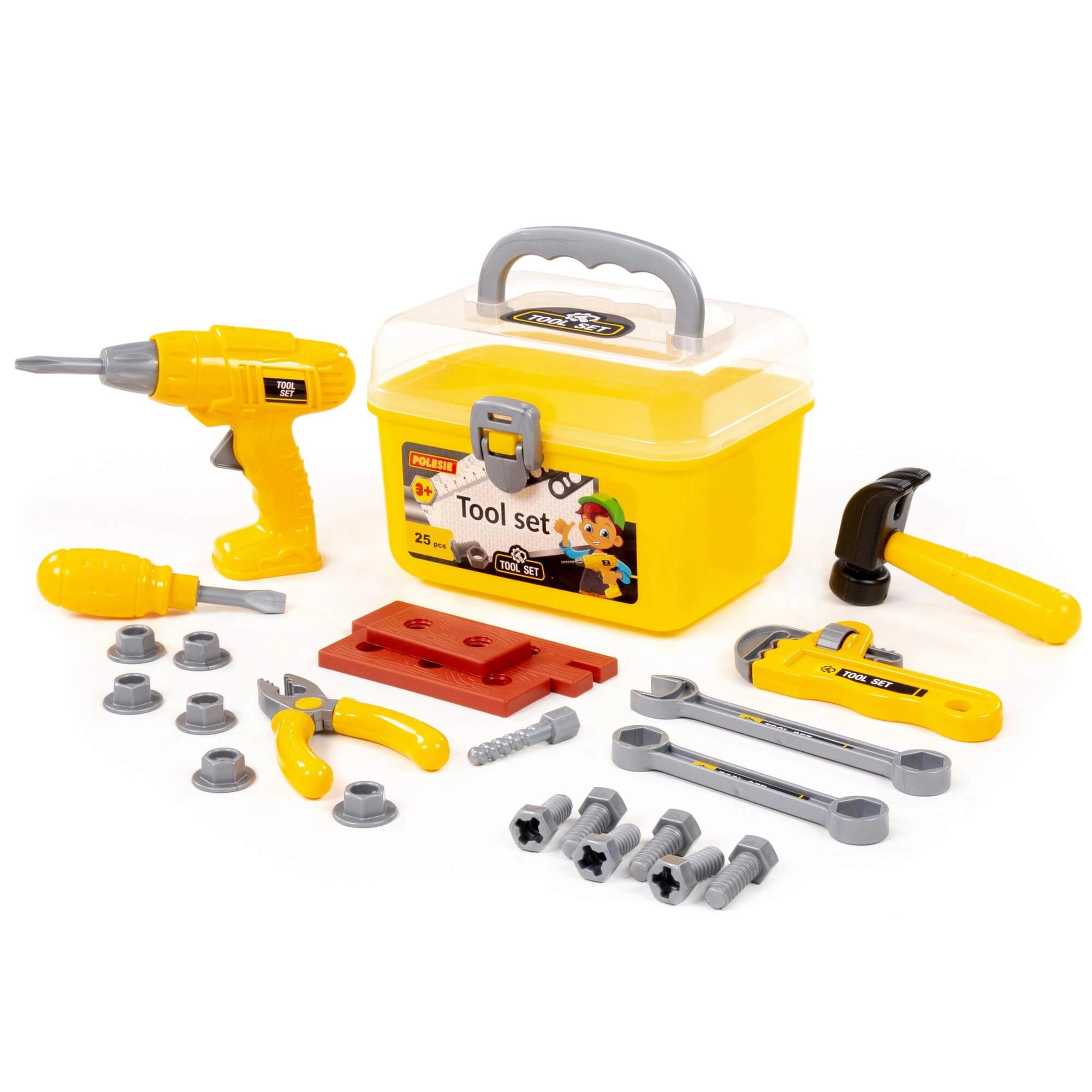 Bevat favoriete tools voor kinderklusjes – bijvoorbeeld een boor, hamer, schroevendraaier, tang, sleutels, moeren en bouten om te schroeven en te monteren.