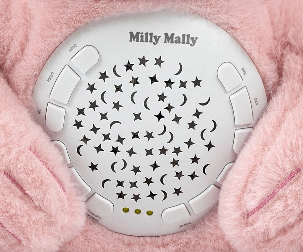 De pluchen teddybeer MILLY MALLY biedt kinderen een rustige slaap en een gevoel van veiligheid. De geïntegreerde projector tovert zachte sterren op het plafond en de muren, terwijl kalmerende melodieën en witte ruis helpen te ontspannen en makkelijker in slaap te vallen. De zachte, fluweelachtige afwerking nodigt uit tot knuffelen en is geschikt vanaf de geboorte.