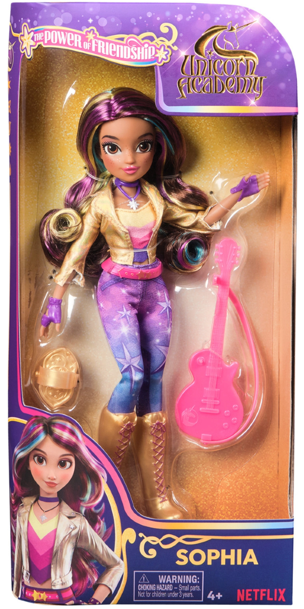 Stap de magische wereld van UNICORN ACADEMY binnen met de 24 cm grote pop Sophia van Spin Master. De stijlvolle heldin met lang gekleurd haar, een gouden jas en rijleggings biedt een realistische weergave van het personage uit de serie, 9 scharnierpunten voor eenvoudig poseren en rijke accessoires voor creatief spel. Een geweldige keuze voor sprookjesfans, fantasierijk spel en verzamelaars.