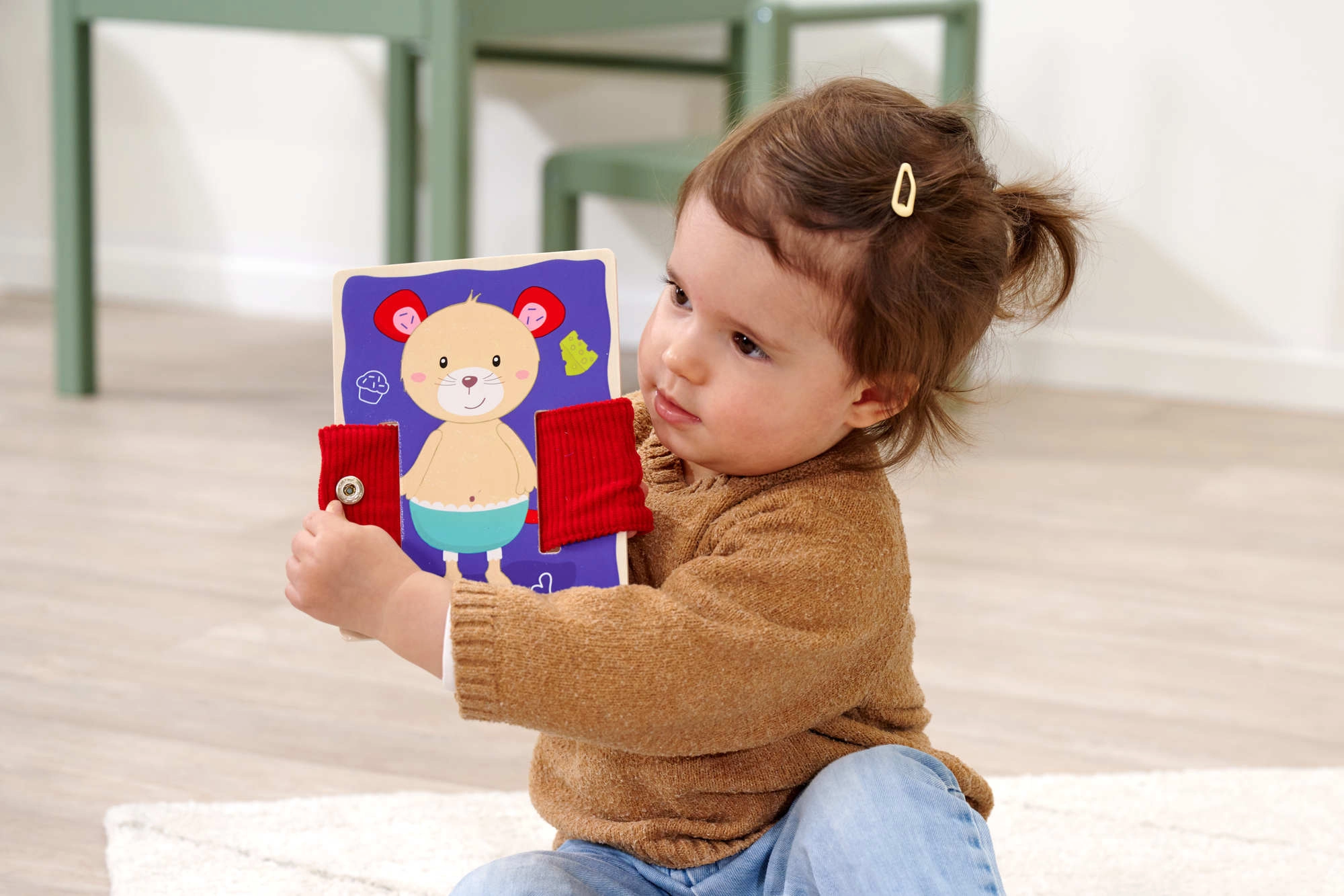Elk bordje biedt een ander type sluiting – kinderen oefenen met ritsen, drukknopen, gespen, knopen en veterstrikken en krijgen zo meer zelfvertrouwen bij het aankleden.