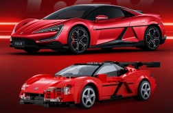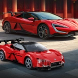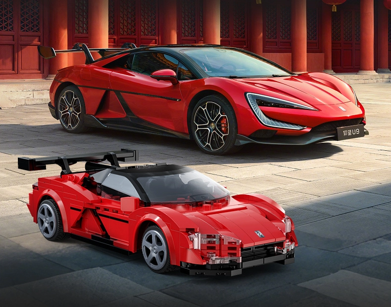De rode carrosserie met bedrukking, transparante koplampen en grote achtervleugel bootsen de look van de YANGWANG U9 sportwagen natuurgetrouw na.