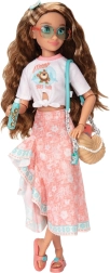 De outfit in roze en turquoise tinten met oceaanprint wordt aangevuld met een zonnebril, schoudertas, drankje, haarband en smartphone. Afneembare kleding en schoenen maken eenvoudig omkleden en stylen mogelijk, terwijl de stevige constructie zorgt voor een lange levensduur en veilig speelplezier.
