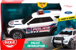 De FORD INTERCEPTOR politiewagen valt op door het gedetailleerde ontwerp in het wit met Police-opdruk en opvallende elementen. Bij het indrukken van de knop op het dak worden licht- en geluidseffecten geactiveerd – rode en blauwe zwaailichten en een realistische sirene, die de verbeelding en actiespel van kinderen versterken.