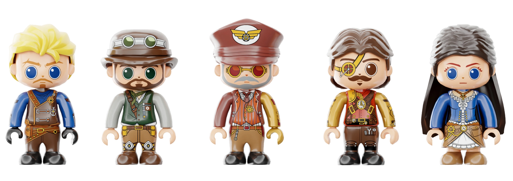 Zijpropellers draaien rond; touwen en tandwielen benadrukken de authentieke steampunklook. Het model maakt indruk tijdens het spelen én in de vitrinekast.