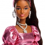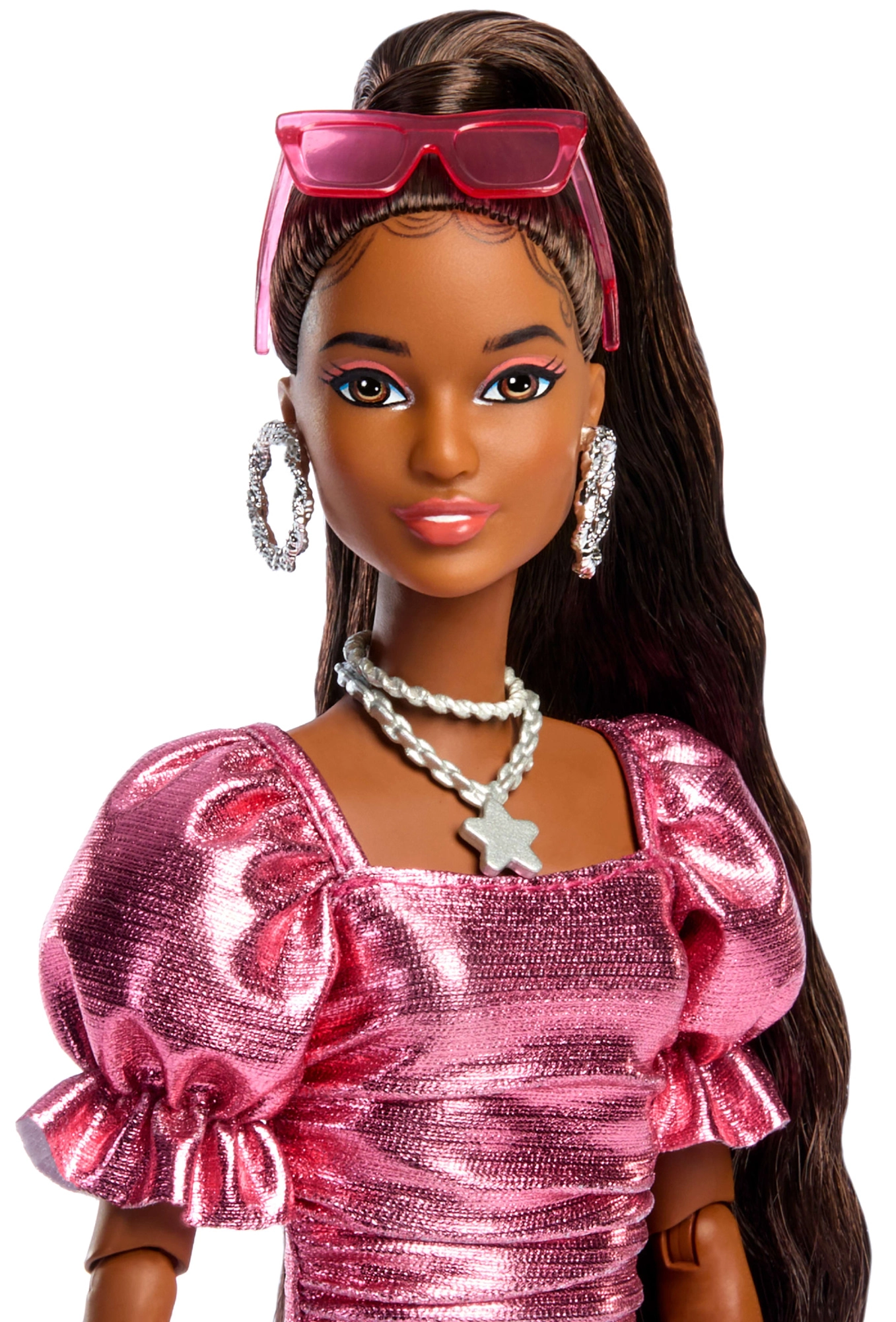 De BARBIE Deluxe Style-pop valt op door haar moderne look en hoogwaardige materialen. De glanzende koraalkleurige jurk met volumineel onderstuk, roze bril, oorringen, gelaagde ketting en elegante handtas vormen de perfecte outfit voor de catwalk en alledaagse verhalen. Lang, donker haar in een hoge paardenstaart benadrukt de trendy look.