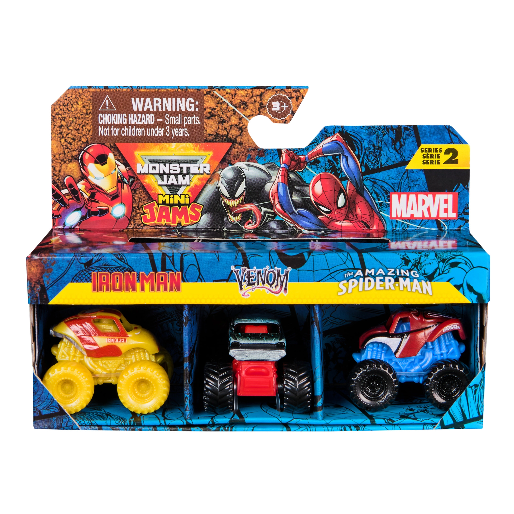 Het trio mini-trucks met IRON MAN-, VENOM- en SPIDER-MAN-thema valt op door opvallende kleuren en graphics geïnspireerd door superhelden.