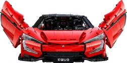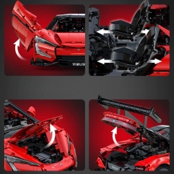 Getrouwe rode carrosserie met bedrukte details, sportvelgen en een aerodynamische vleugel. Afmetingen na montage ca. 60,5 × 29,5 × 16 cm – een blikvanger in elke collectie.