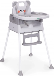 Voor de veiligheid zorgen de 5-puntsgordel, de tussenbeen-veiligheidsstop tegen wegglijden en antislippootjes. Het brede dubbele dienblad met opstaande randen en bekerhouder is verstelbaar; de bovenste laag is eenvoudig afneembaar en vaatwasmachinebestendig. De voetsteun en ergonomische zitting zorgen voor een correcte zithouding en comfort tijdens eten en spelen.