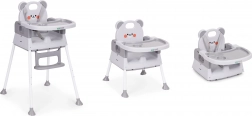 Eén stoel voor drie situaties. Hoog voeren, laag zitten om te spelen of als veilige verhoger op een eetkamerstoel – ideaal voor kleine ruimtes en op reis.