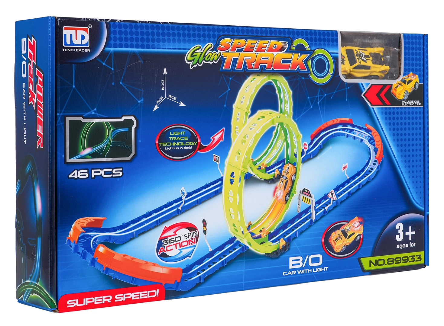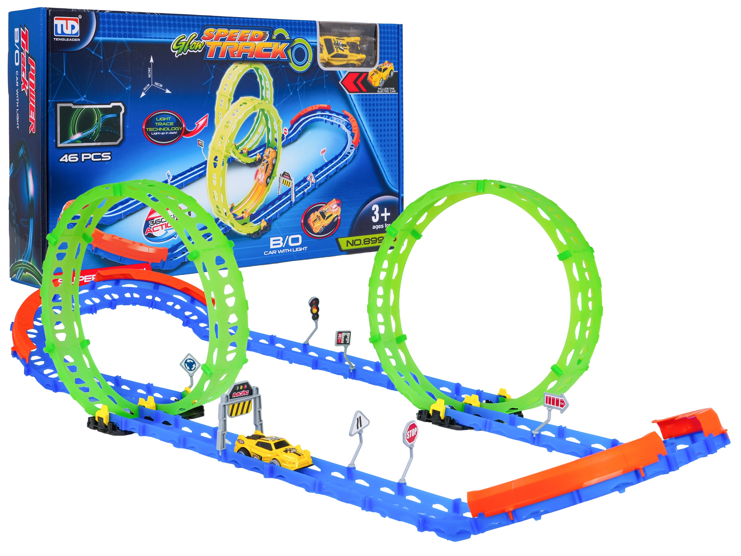 Deze fluorescerende racebaan is ideaal voor kinderen vanaf 3 jaar. Dankzij de twee grote loops en stevige zijbarrières rijdt het autootje veilig door zelfs de scherpste bochten. Lichtgevende elementen verlichten het rijden in schemer en toveren de kamer om tot een mini-racecircuit.