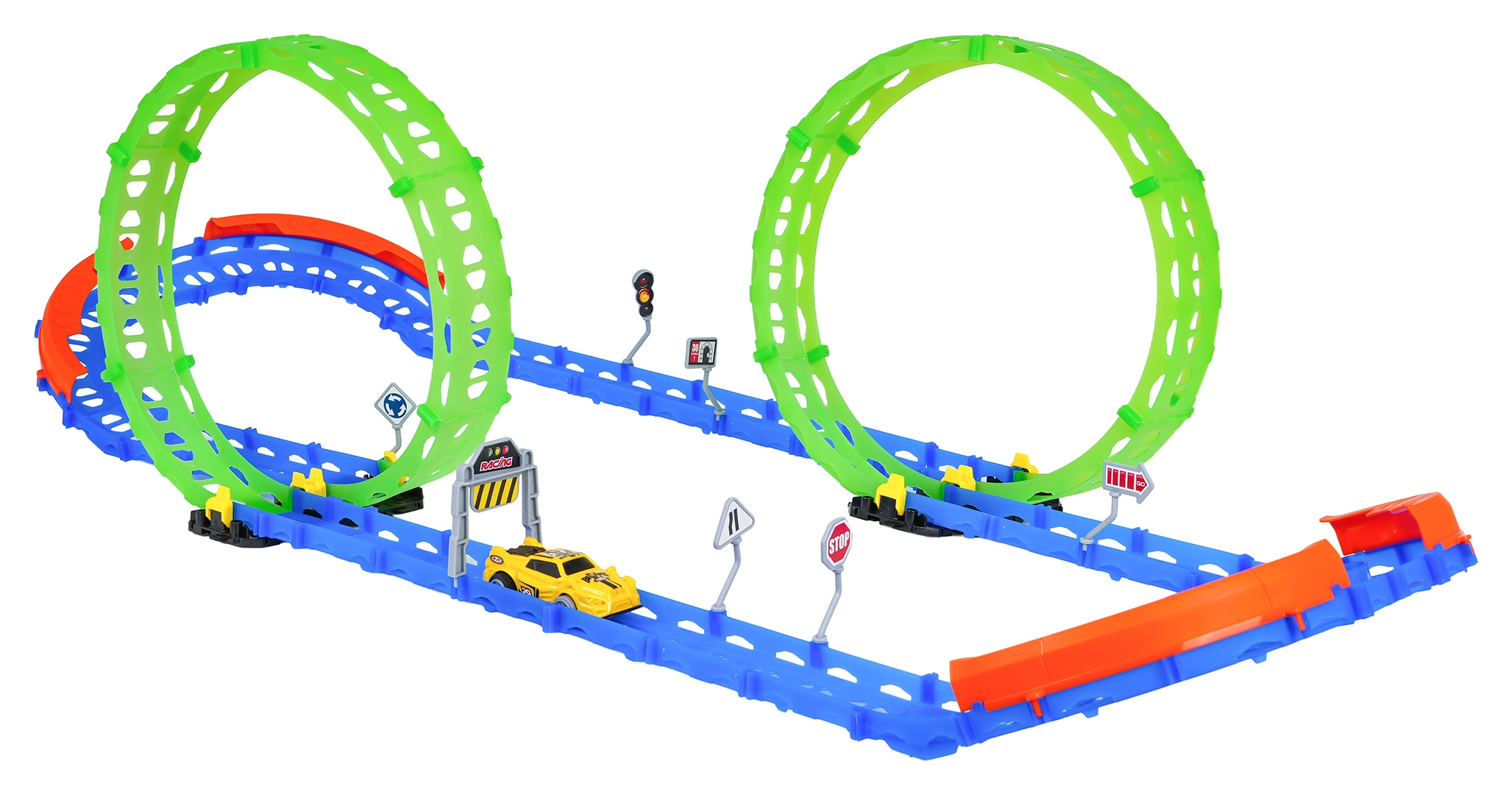 Twee grote fluorescerende loops zorgen voor indrukwekkende stunts, zelfs met het licht uit, en maken van racen een onvergetelijke ervaring.