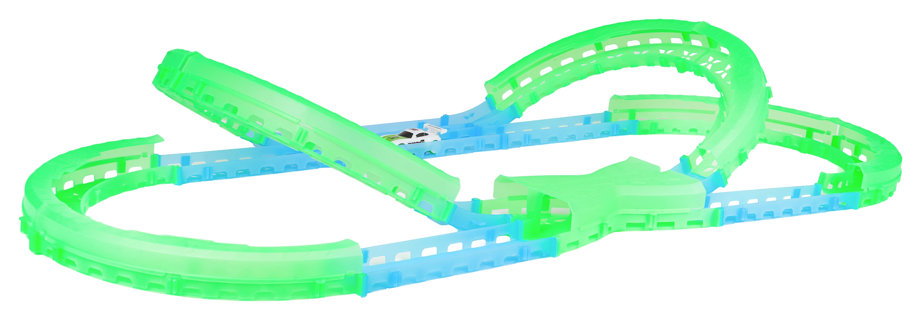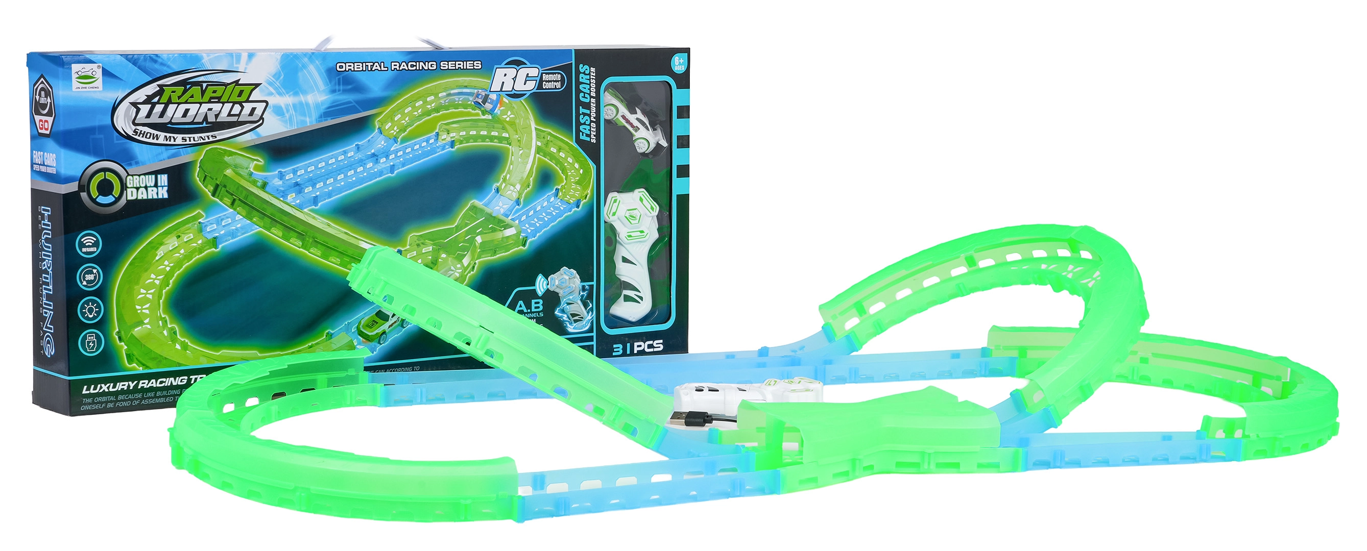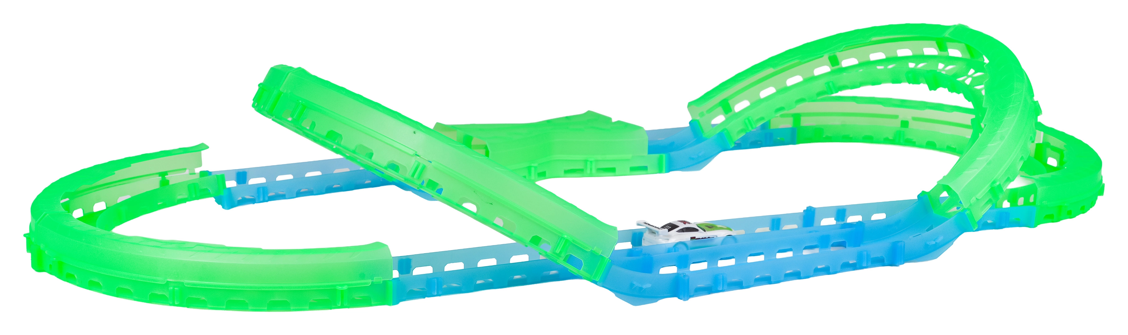 Deze grote lichtgevende racebaan is ideaal voor kinderen vanaf 6 jaar. Fluorescerende delen lichten op in het donker en het autootje met LED-verlichting zorgt tijdens het rijden voor betoverende lichteffecten. In de verpakking vind je een afstandsbediening, USB-kabel voor het opladen en alles wat nodig is om een stabiele en leuke baan te bouwen.