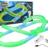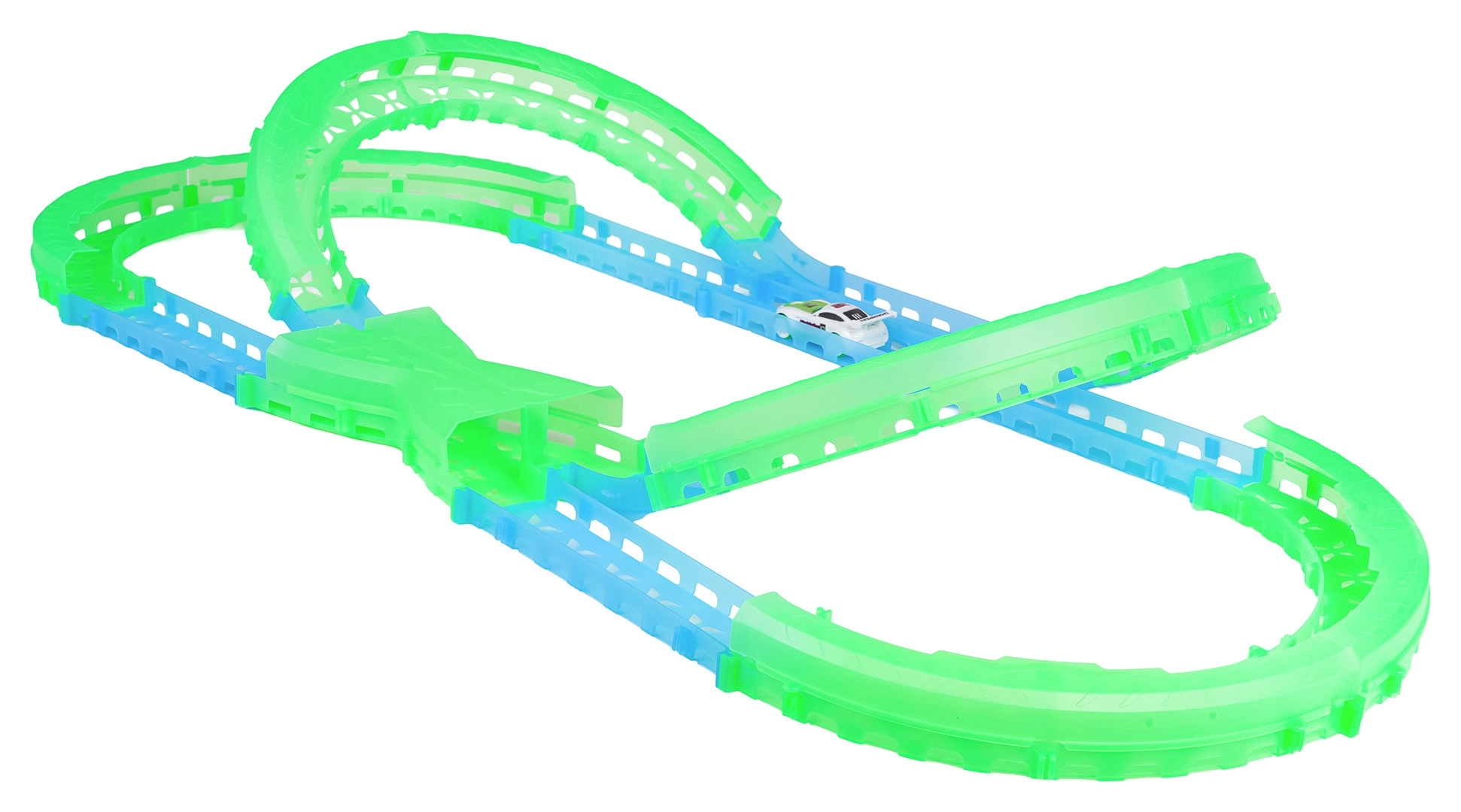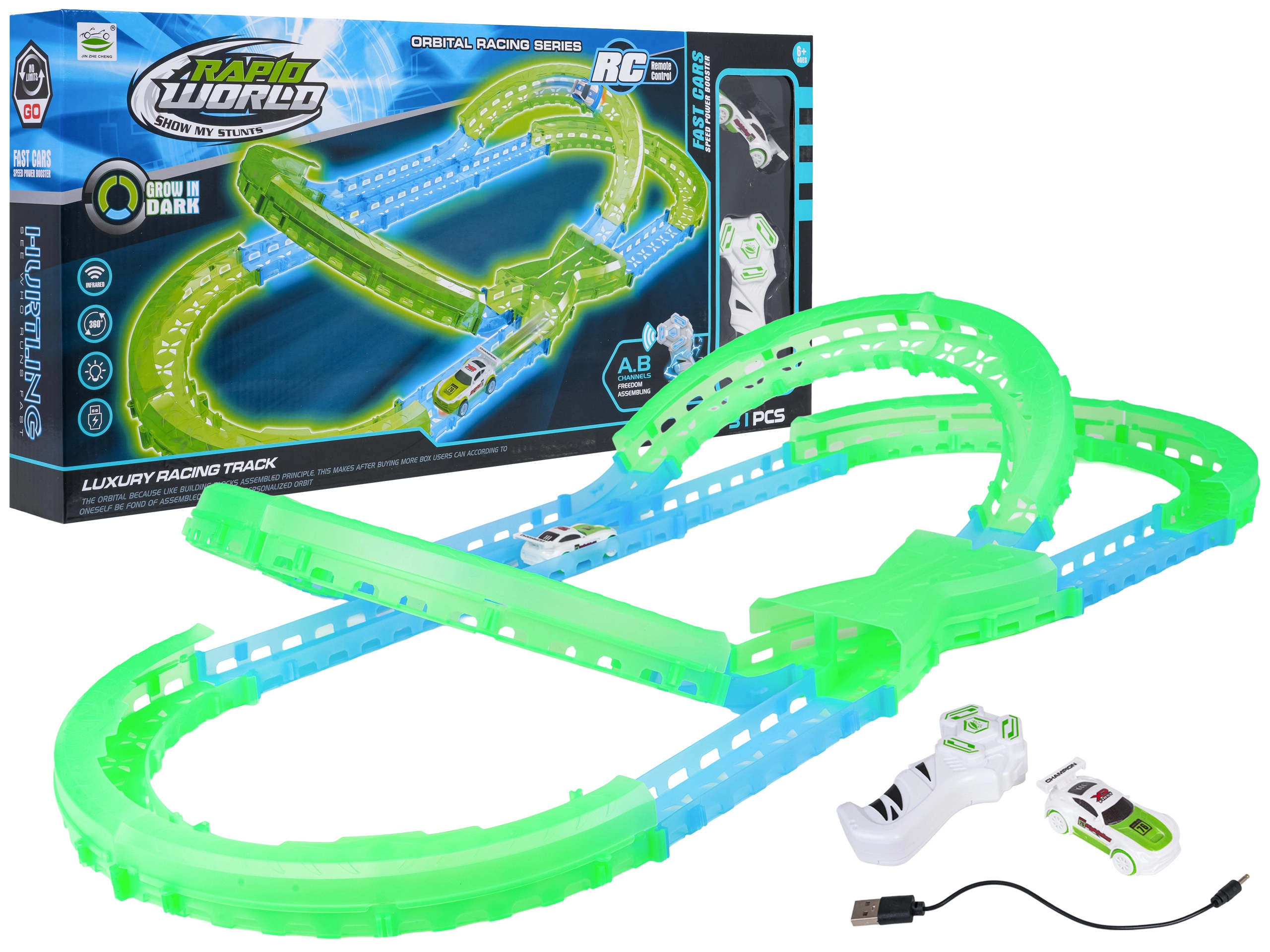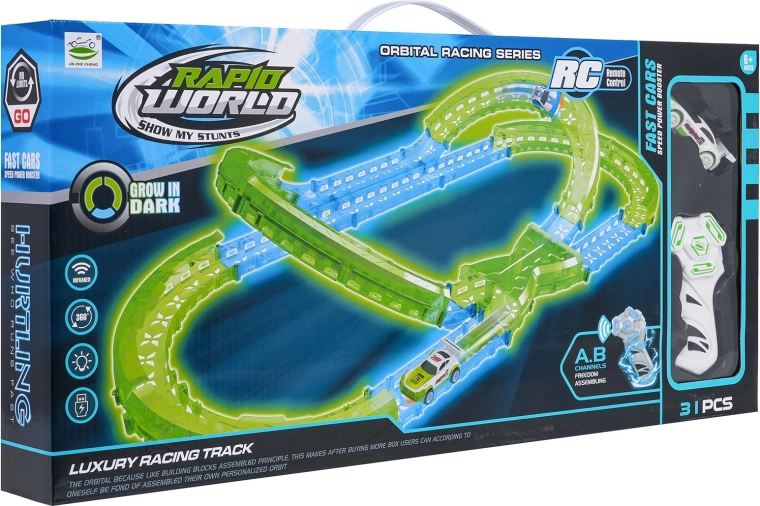 Deze grote lichtgevende racebaan is ideaal voor kinderen vanaf 6 jaar. Fluorescerende delen lichten op in het donker en het autootje met LED-verlichting zorgt tijdens het rijden voor betoverende lichteffecten. In de verpakking vind je een afstandsbediening, USB-kabel voor het opladen en alles wat nodig is om een stabiele en leuke baan te bouwen.