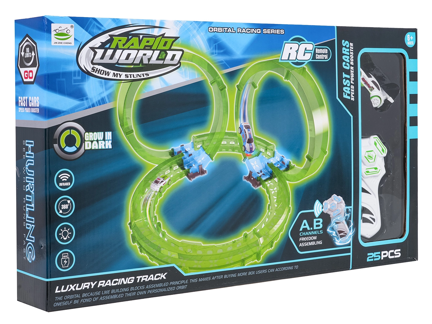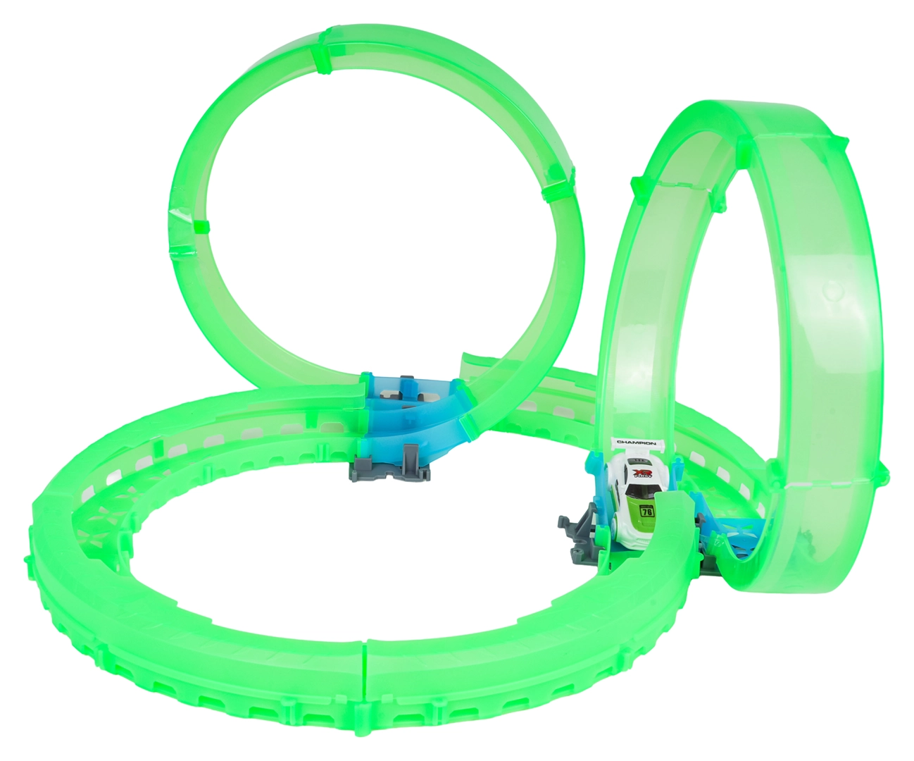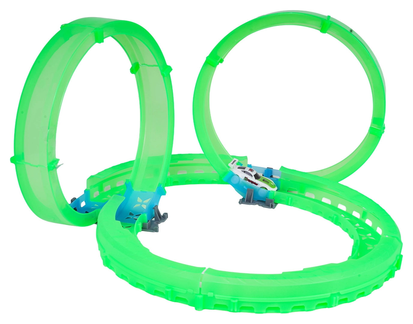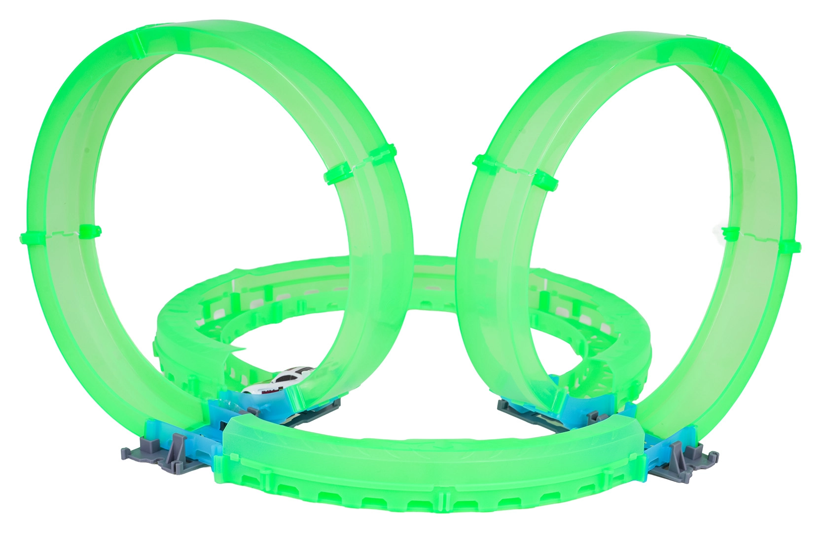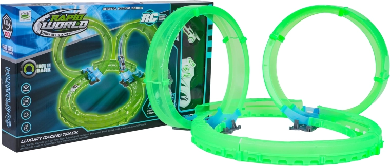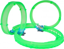 Deze compacte racebaan met lichtgevende, transparante delen biedt een dynamische rit met opvallende lichteffecten. Het autootje met LED-verlichting raast door loopings en bochten en laat een spectaculaire lichtspoor achter in het donker. Dankzij de afstandsbediening heb je snelheid en richting altijd onder controle.
