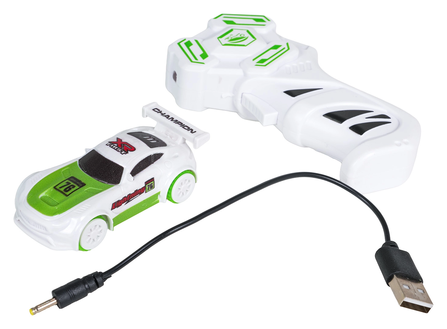Het compacte raceautootje met LED-verlichting bedien je met de meegeleverde controller. Opladen gebeurt via de meegeleverde USB-kabel.