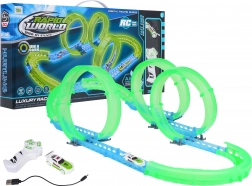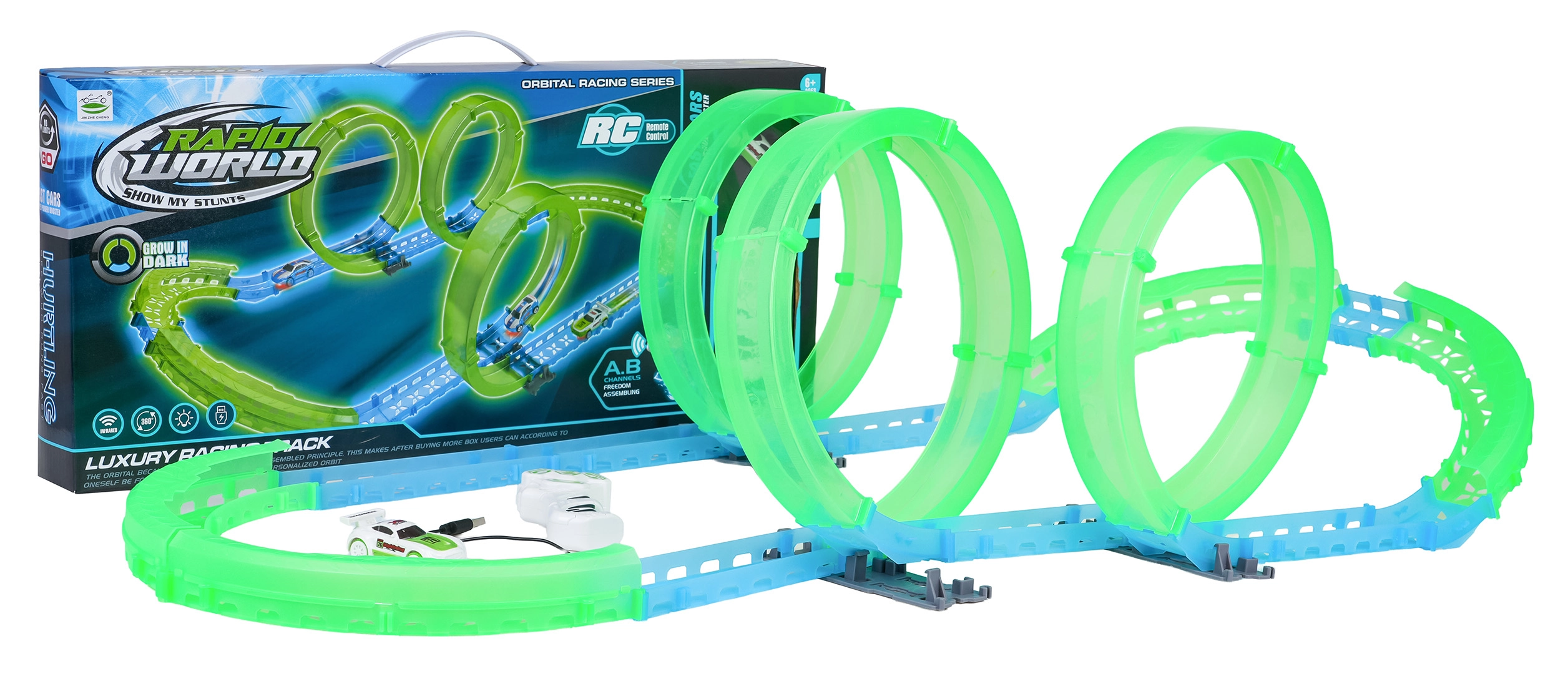 Bouw je eigen stuntbaan en geniet van het racen, ook na zonsondergang. De fluorescerende onderdelen lichten op in het donker en het kleine RC-autootje rijdt vooruit over de voorbereide baan. Dankzij de LED-verlichting ontstaan tijdens het rijden spectaculaire lichtsporen.