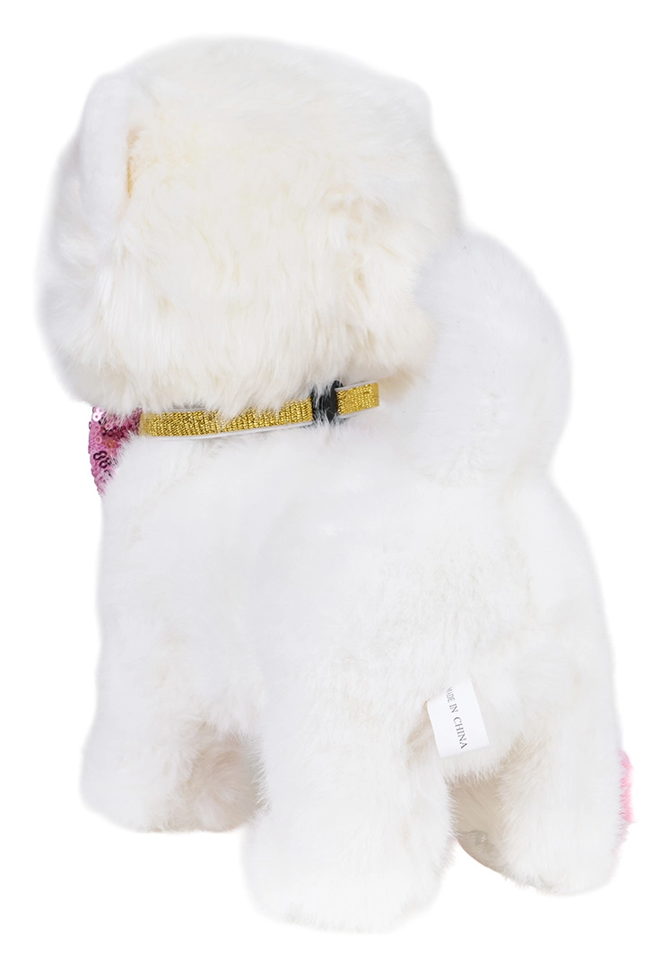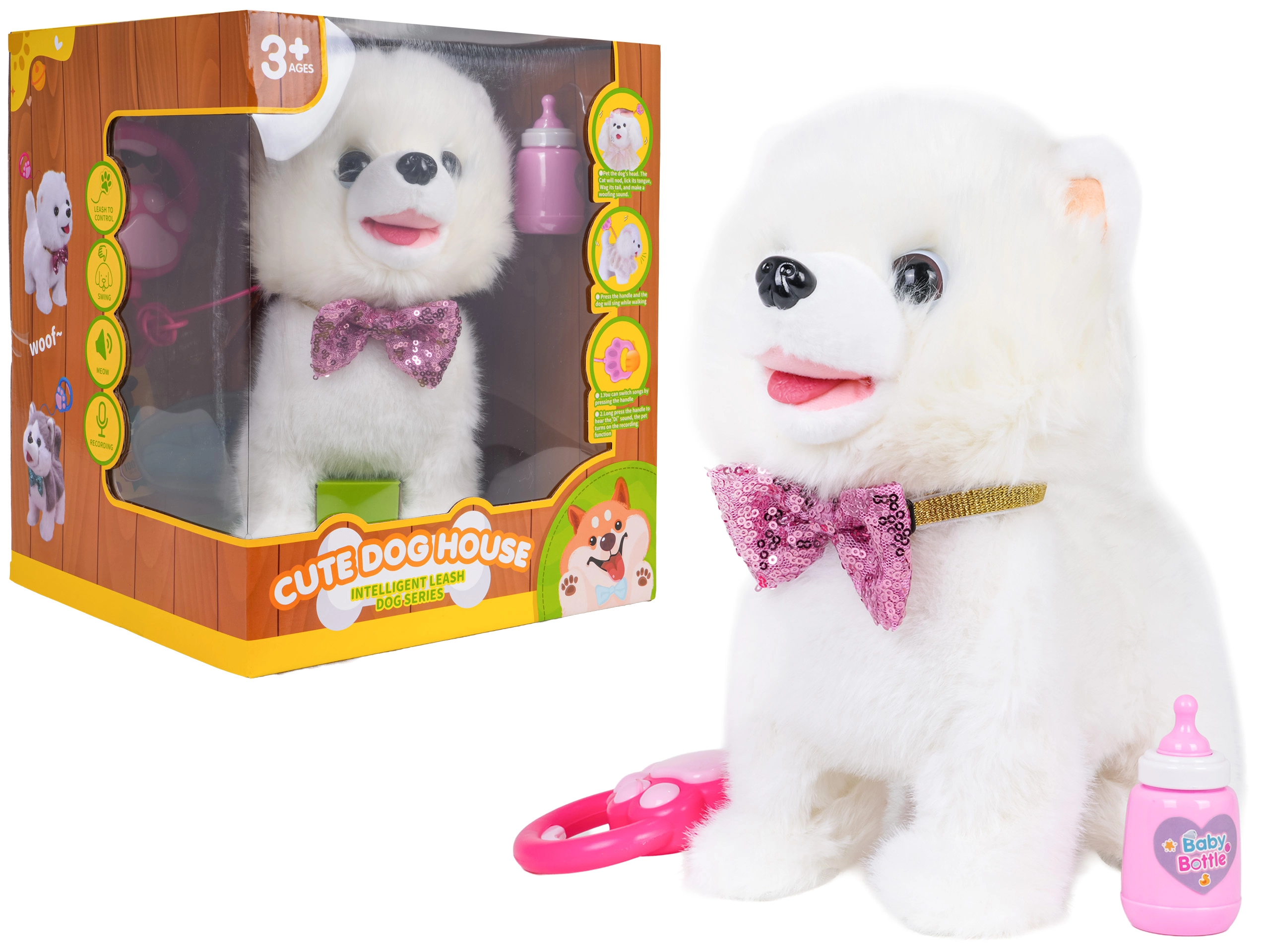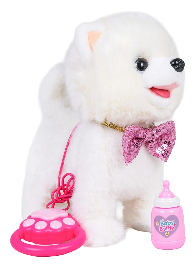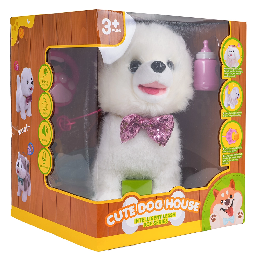 Schattige witte interactieve hond voor kinderen vanaf 3 jaar, vol plezier en knuffelmomenten. Gemaakt van zachte en veilige materialen, kan lopen, blaffen, met de staart kwispelen, met het hoofd knikken en zelfs met het tongtje likken. Dankzij de controller/lus reageert hij op een druk, loopt hij op het ritme van de muziek en heeft hij een opname- en afspeelfunctie, zodat hij je woorden schattig herhaalt. Inclusief een voedingsflesje voor nog realistischer spel.