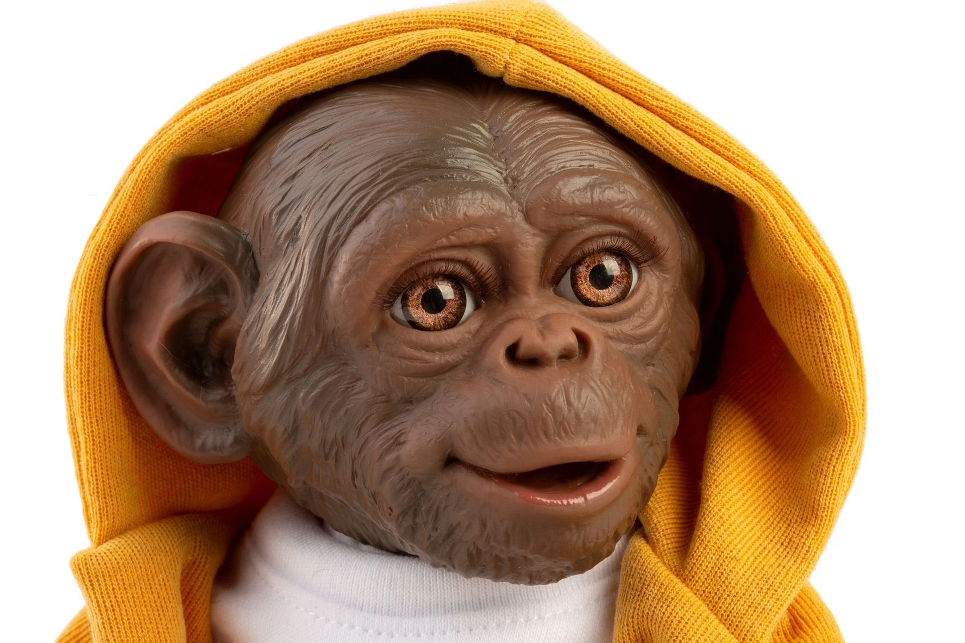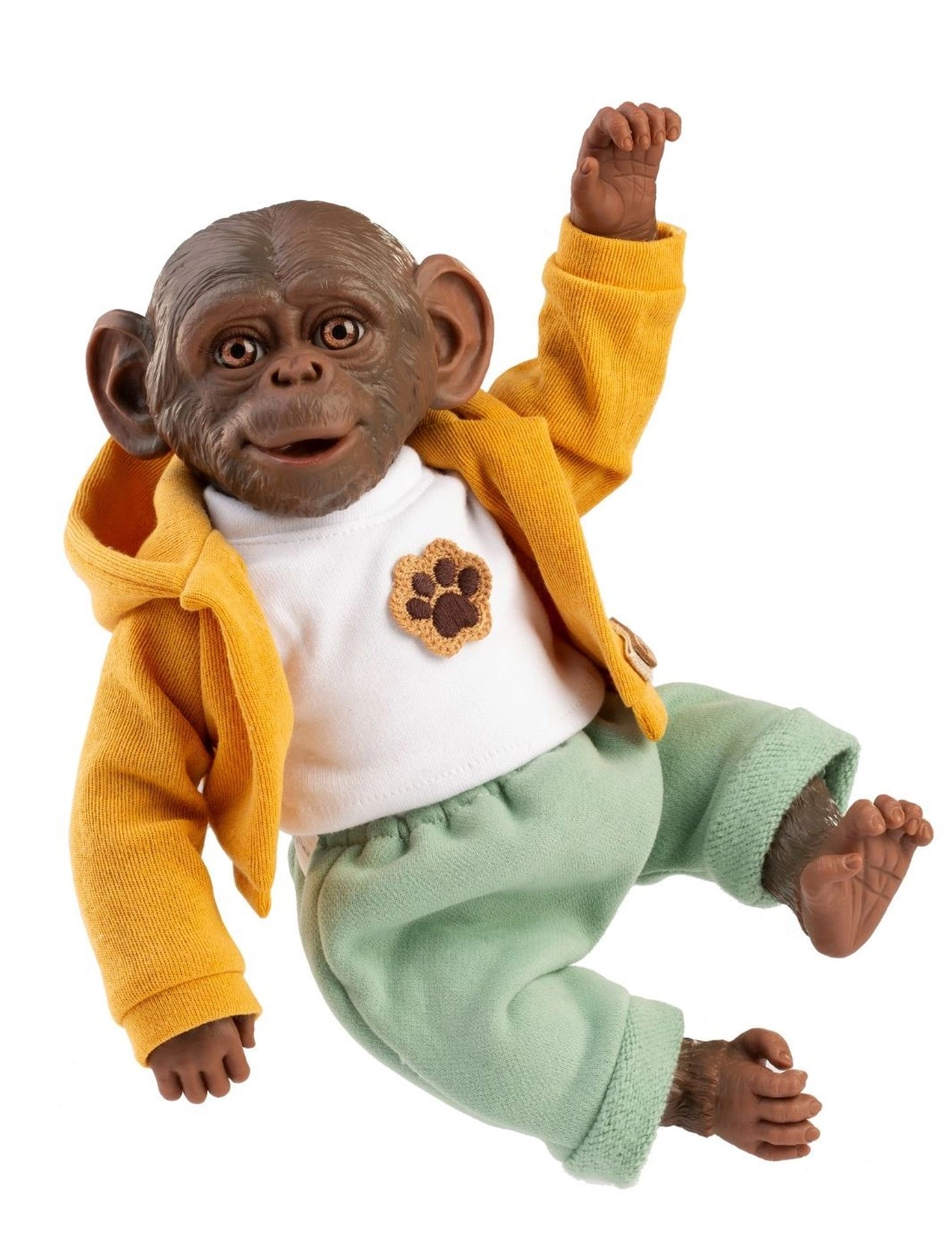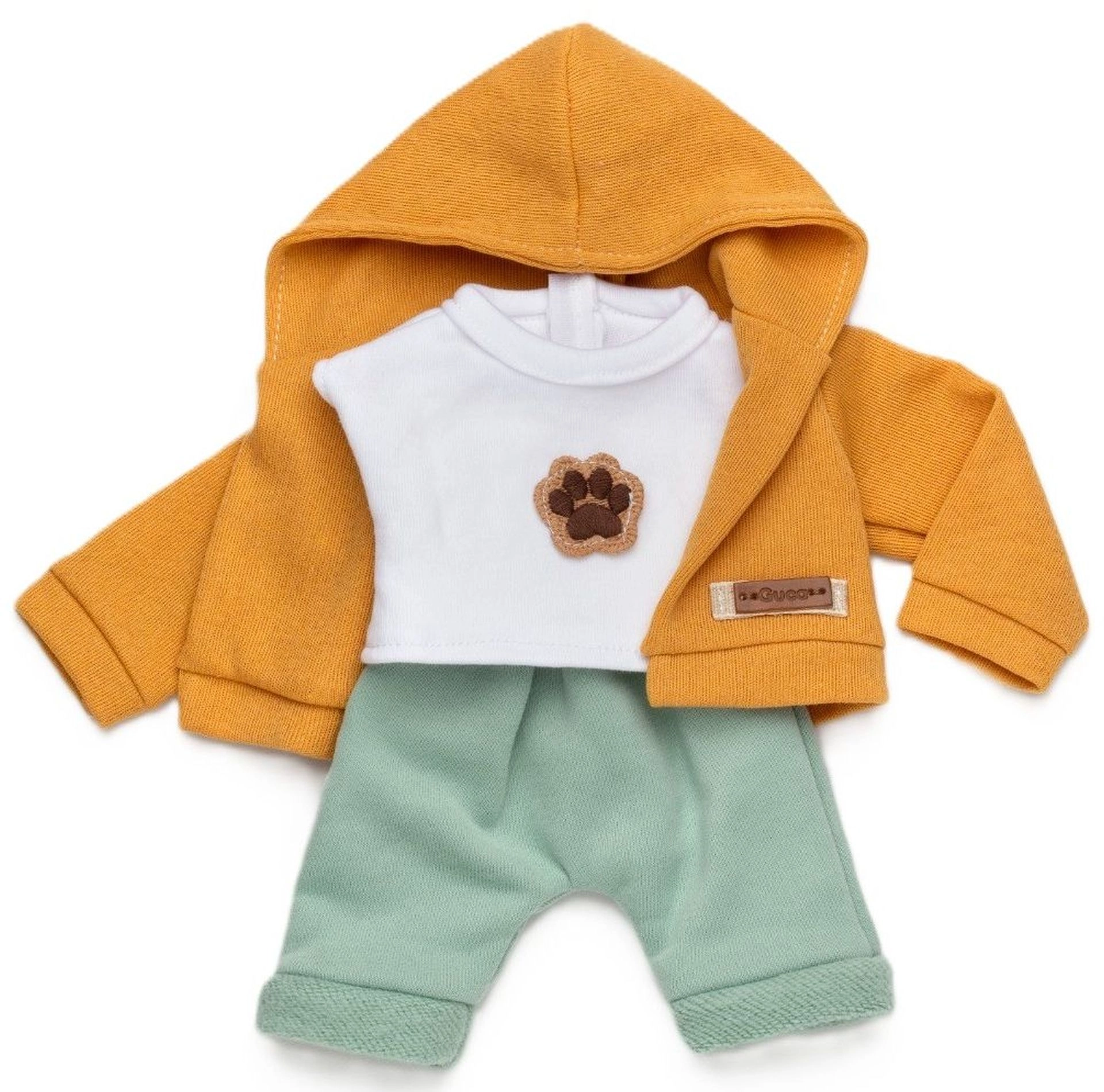 Geef je Reborn aapje van 32 cm een unieke stijl. Deze 3-delige set combineert comfort met een schattig design: een mosterdkleurige hoodie voor warmte en stijl, een wit T-shirt met poot-applicatie en een mintgroene broek met zachte boorden voor een perfecte pasvorm. De kleding is ontworpen voor vaak omkleden en eenvoudig onderhoud.
