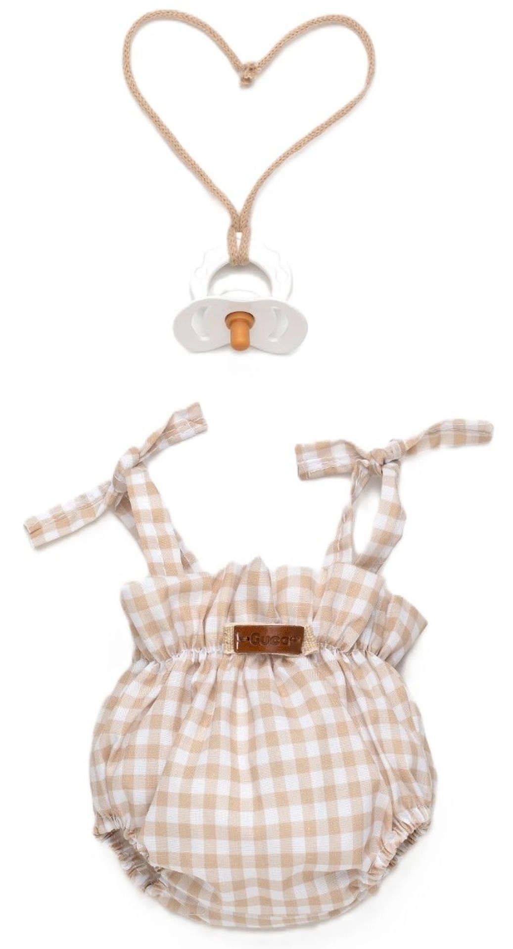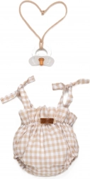 Beige-wit geruite romper met strikbandjes, elastische pijpjes en een gerimpelde taille zit veilig op de pop en staat prachtig op foto’s.