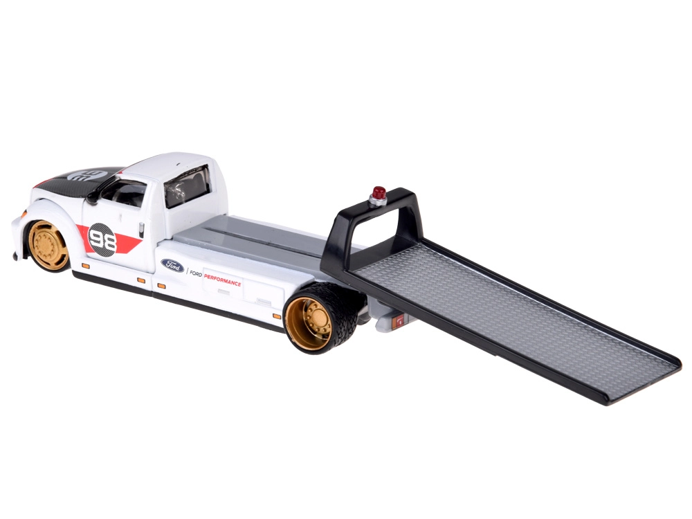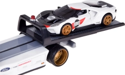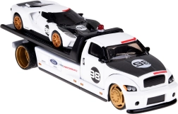 Stijlvolle verzamelset op schaal 1:64 combineert een metalen takelwagen met verschuifbaar platform en een gedetailleerde sportwagen FORD GT Heritage 2021. In elegant wit met racestickers en vrij draaiende wielen biedt hij een geweldige uitstraling voor in de vitrinekast én speelse laad- en losfuncties.