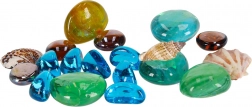 In het blok vind je gladde, glanzende steentjes in blauwe, groene en amberkleurige tinten en kleine schelpjes. Elk stuk is uniek.