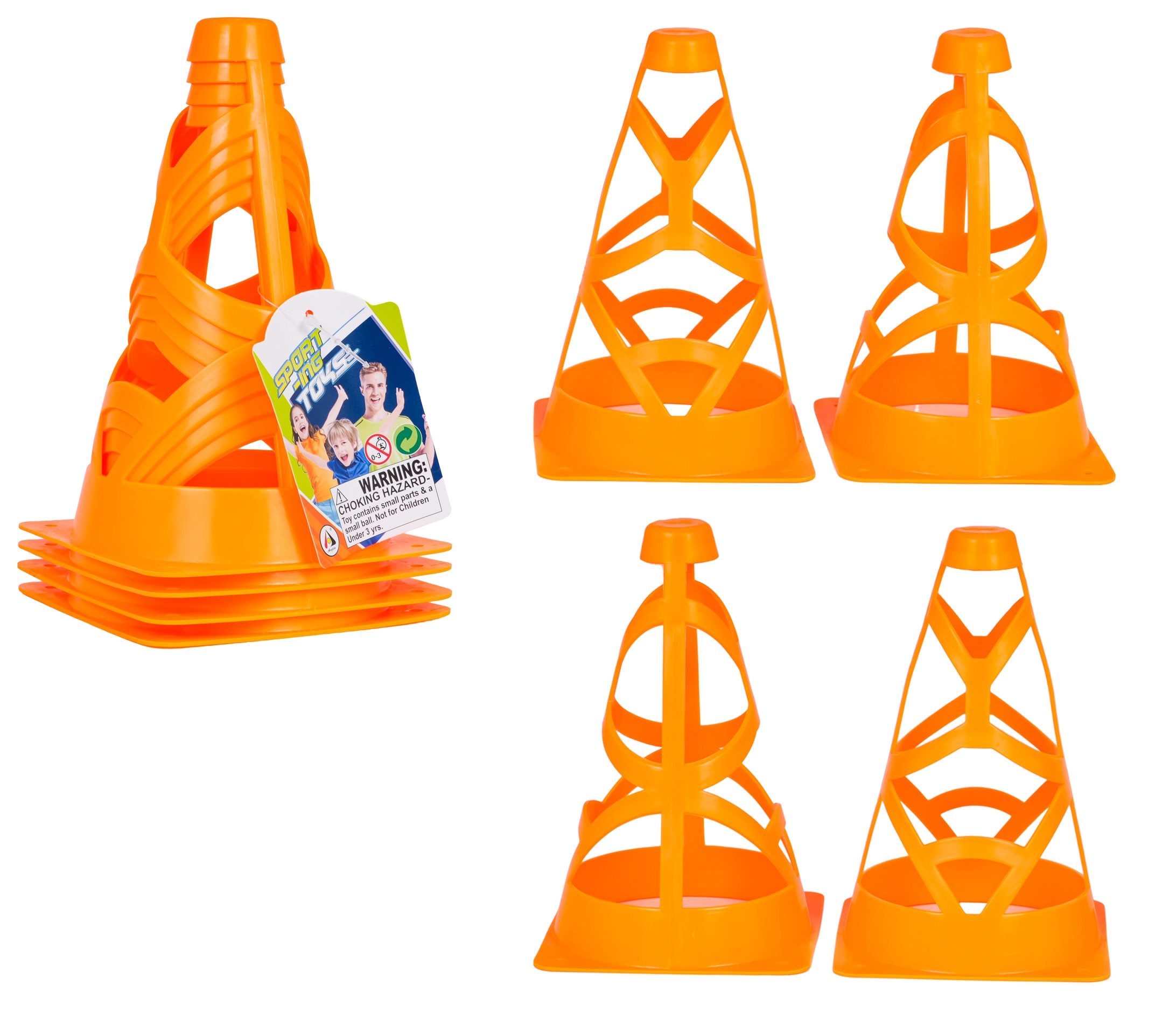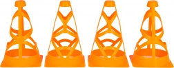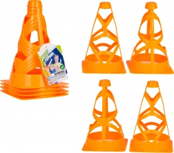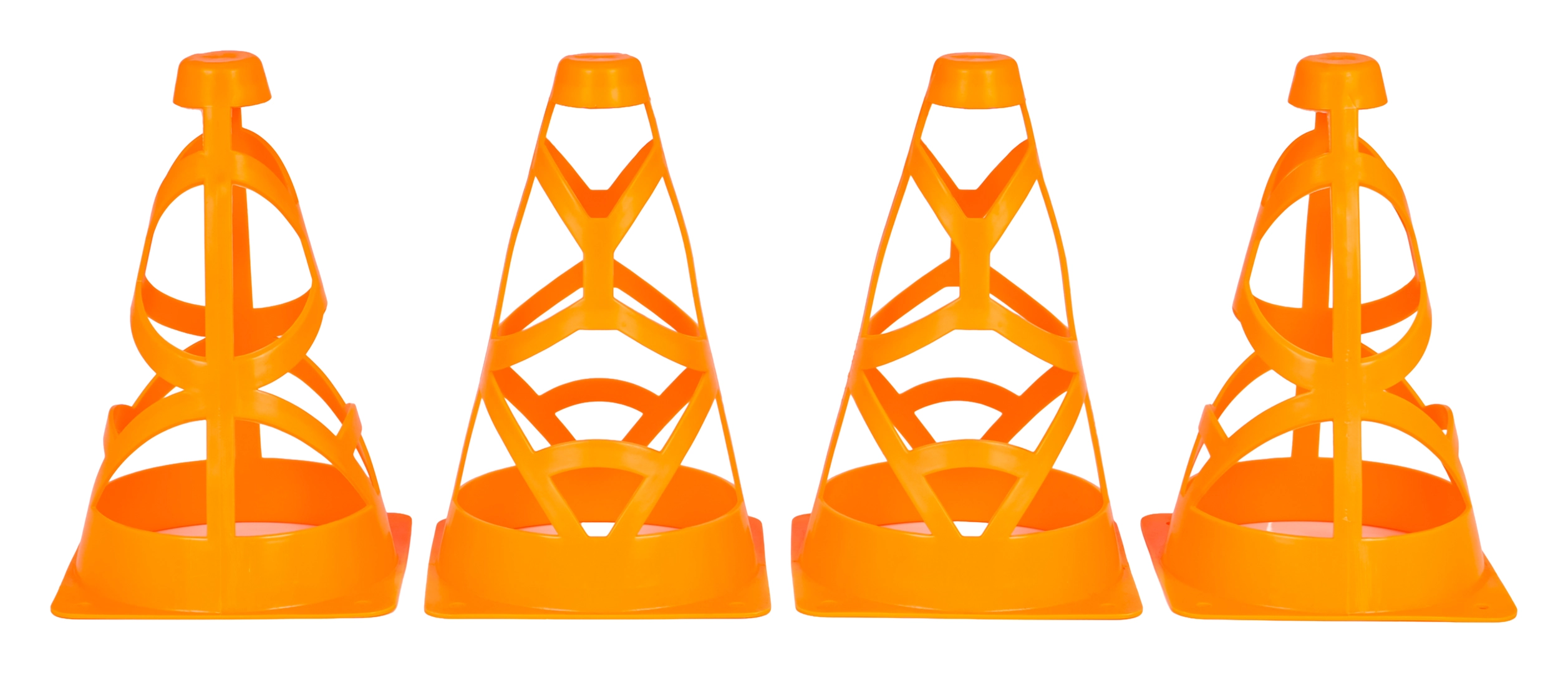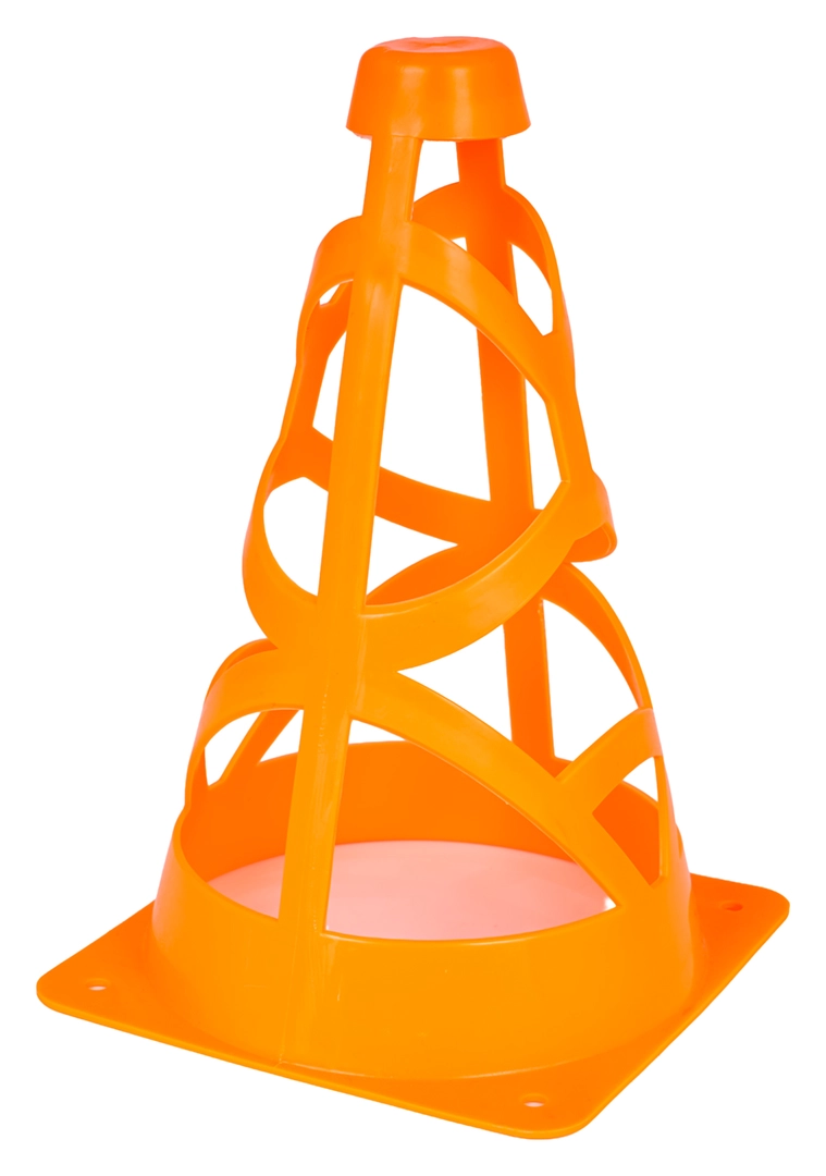 Universele trainingskegels in een opvallende oranje kleur helpen bij het markeren van banen, zones en obstakels tijdens spel en sport. Dankzij de lichte kunststof constructie zijn ze makkelijk te vervoeren en hun stapelbare vorm bespaart ruimte bij opslag. De open “rooster”structuur en de gaten in de hoeken van de basis maken veilige verankering mogelijk en verminderen windweerstand.