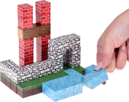 Een gevarieerde mix blokken met prints van gras, water, baksteen, steen en hout laat je huizen, terrein en bomen bouwen – precies zoals jij het wilt.