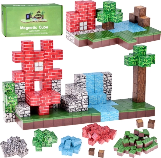 Ontdek een creatieve wereld met magnetische blokken in de vorm van pixelkubussen. Set van 144 stukjes met prints van gras, water, baksteen, steen en hout om huisjes, tuinen en hele landschappen te bouwen. Dankzij de sterke, verborgen magneten zijn bouwwerken stabiel en makkelijk te verbouwen. Inclusief opbergzakje en inspiratiefolder.