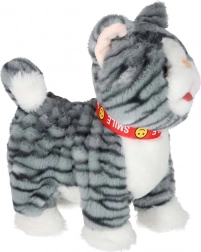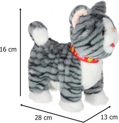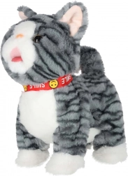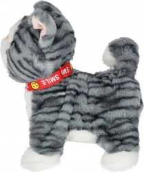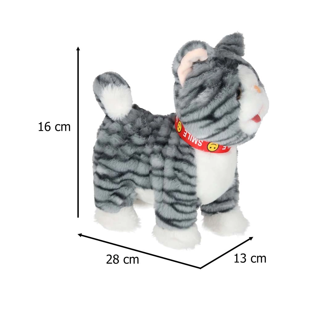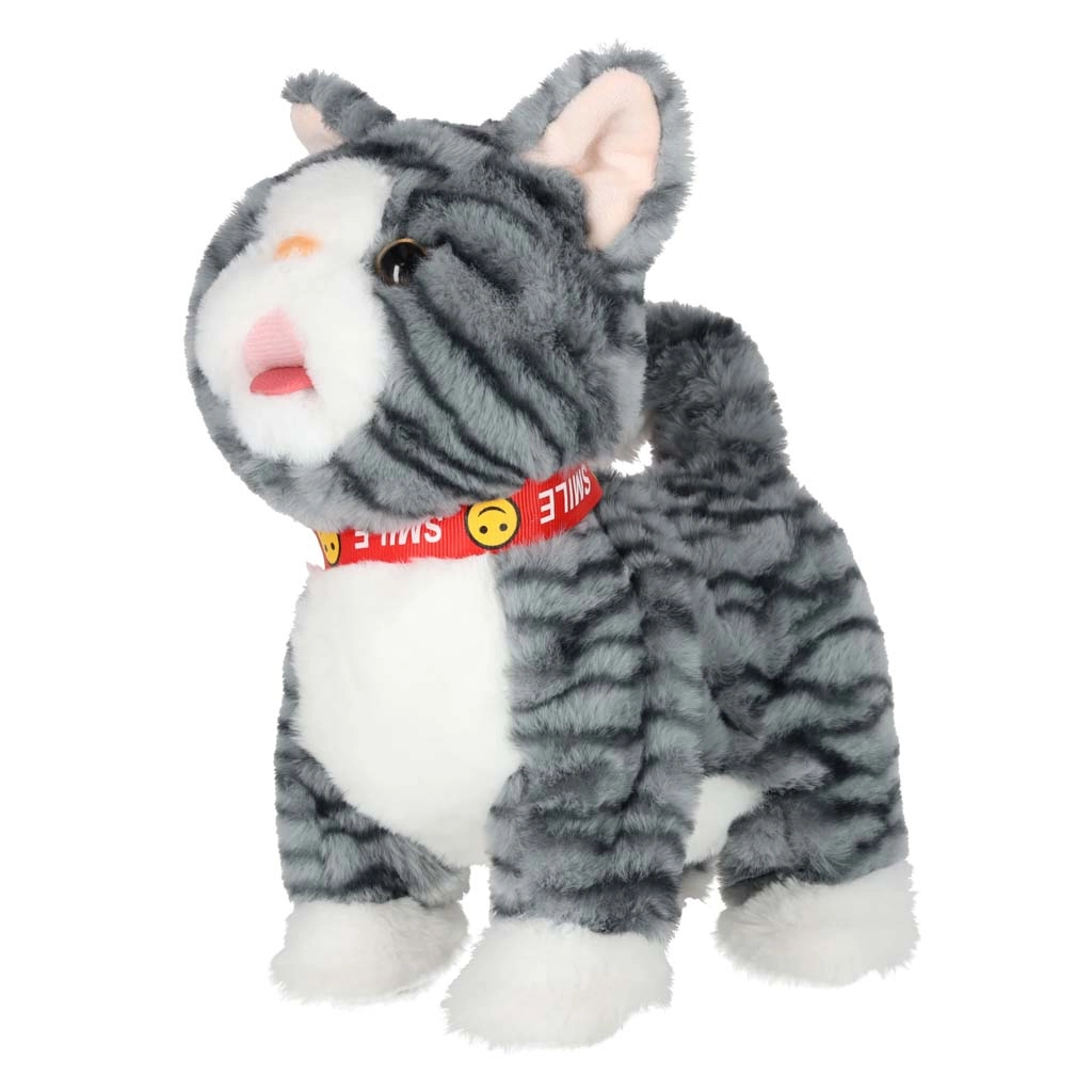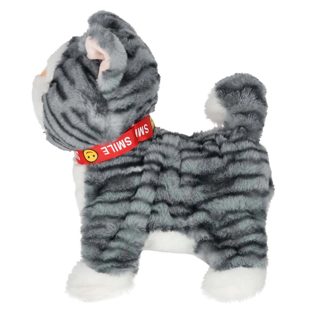 De zachte grijs gestreepte vacht, roze oortjes en een kraagje met motieven geven het speelgoed een eigen karakter. De ideale knuffelvriend.