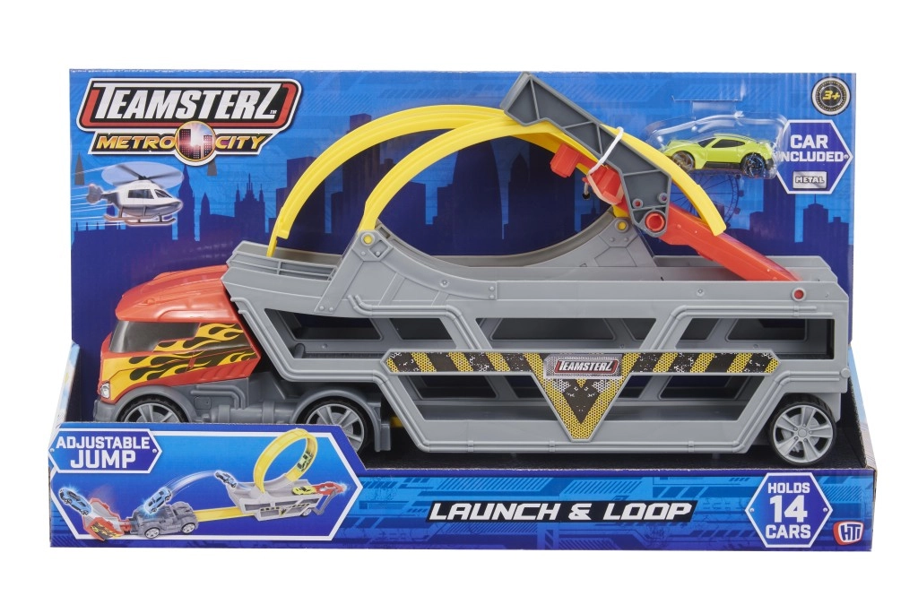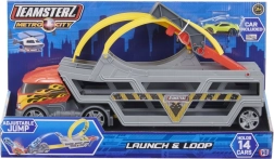 Ontdek de leuke speelset voor kleine racers: TEAMSTERZ multifunctionele transporter met autootje en looping. De robuuste draagbare vrachtwagen in grijs met rood biedt een looping, een sprongramp, een opwind-lanceerder en plaats voor tot 14 autootjes. Inclusief een metalen die-cast autootje voor direct speelplezier.