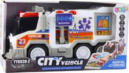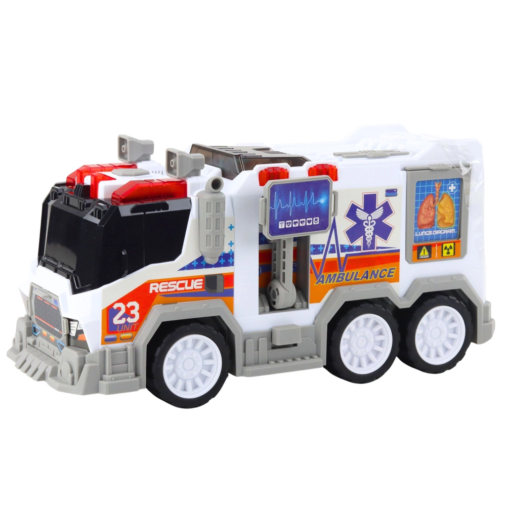 Deze gedetailleerd uitgewerkte ambulance valt op met een geliefde wit-rode kleurstelling met blauwe elementen en opvallende medische prints. Na het indrukken van de knoppen worden sirenes en lichteffecten geactiveerd, wat reddingsscènes extra echt maakt.