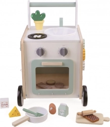 Deze multifunctionele houten loopwagen dient als steun bij de eerste stapjes en tegelijk als volwaardig speelcentrum met keukendetails. Kinderen oefenen hun oog-handcoördinatie, balans en fijne motoriek terwijl ze de wereld van koken en rollenspel ontdekken. De draaiknoppen op de oven geven een prettig klikgeluid, de deurtjes kunnen open en er is praktische opbergruimte voor accessoires.