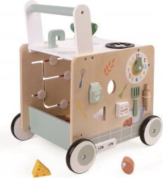 Dankzij het robuuste houten frame is de loopwagen stabiel en duurzaam, en de rubberen wielen zorgen voor stille en veilige beweging over de vloer. Aan vier zijden wachten veel activiteiten: vormen sorteren (voedsel), draaiende tandwielen, groentelabyrint, gootsteen met kraan, kookplaat en een transparante oven. De loopwagen is een ideaal cadeau voor peuters vanaf 12 maanden.