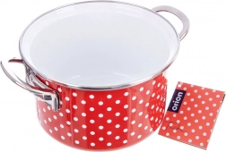 De populaire geëmailleerde pan in het rood met witte stippen brengt een vleugje retrostijl in de keuken en biedt tegelijk praktische eigenschappen voor dagelijks koken. De stevige body van geëmailleerd staal zorgt voor een gelijkmatige warmteverdeling en een lange levensduur, terwijl de roestvrijstalen rand en de robuste zijhandgrepen zorgen voor veilige hantering.