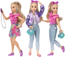 In de verpakking vind je twee complete outfits en veel accessoires voor eindeloze combinaties. Van het glinsterende paarse jasje met paillettenmouwen en de bloemenrok tot de stijlvolle zonnebril en handtas – alles in een maritieme stijl op elkaar afgestemd.