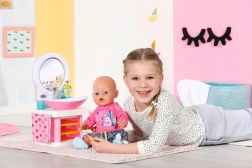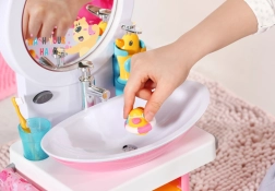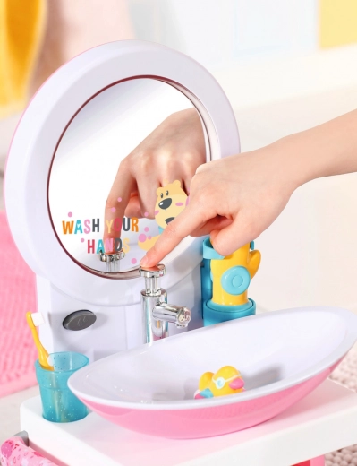 Leer kinderen goede hygiënegewoontes via spel. De wit-roze BABY born poppenwastafel biedt licht- en geluidseffecten, een echte waterstraal bij het indrukken van de kraan en schattige accessoires voor complete verzorging. Wanneer de spiegel oplicht, klinkt een melodie die dient als speelse timer voor het handen wassen.