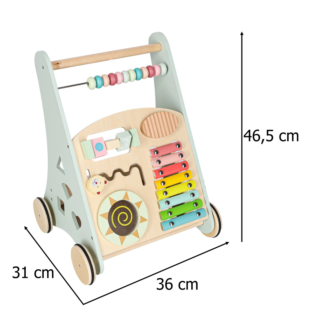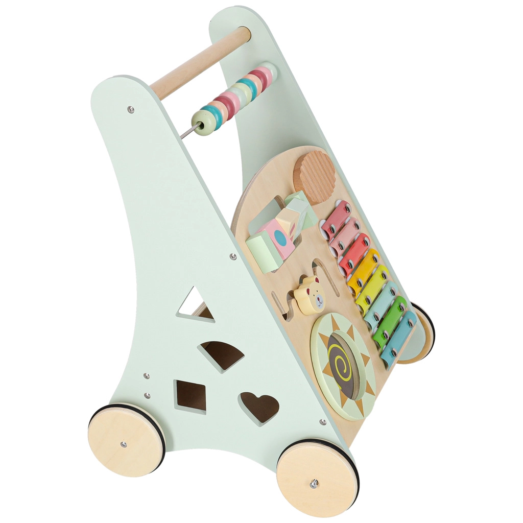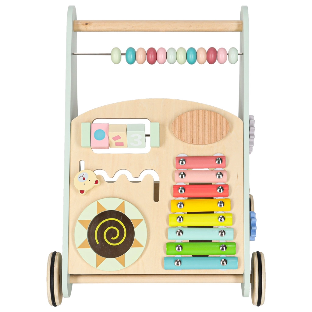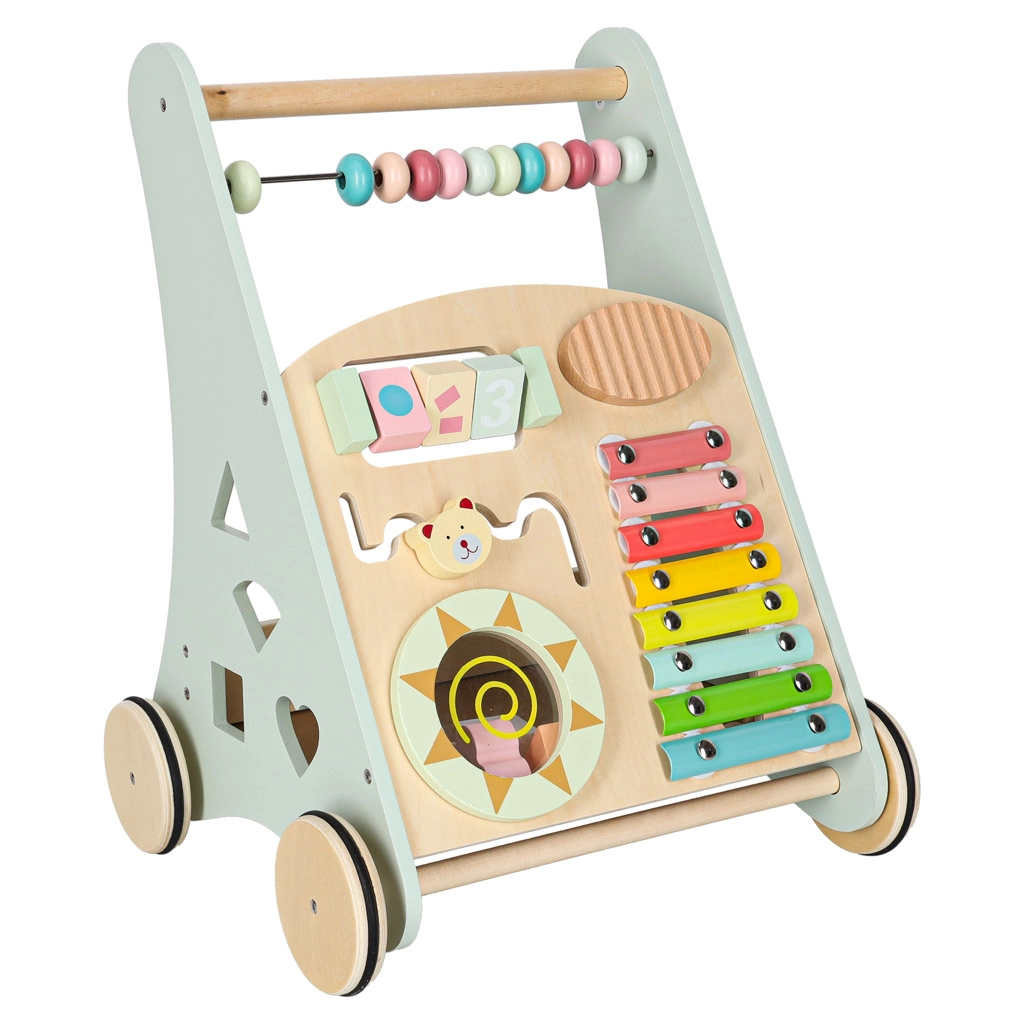 Het multifunctionele houten loopwagentje combineert ondersteuning bij de eerste stapjes met een speels activiteitencentrum. Het kind traint balans, oog-handcoördinatie en fijne motoriek door te duwen, draaien en vormen in te passen. Zachte pasteltinten en glad afgewerkt hout nodigen uit tot ontdekken, terwijl de xylofoon ritme en muzikaal gehoor stimuleert.