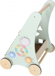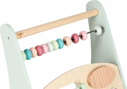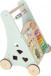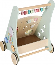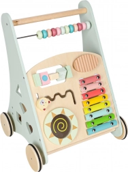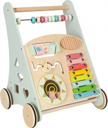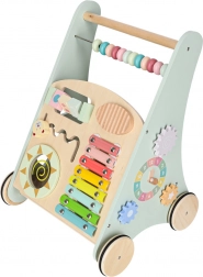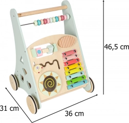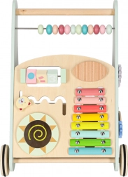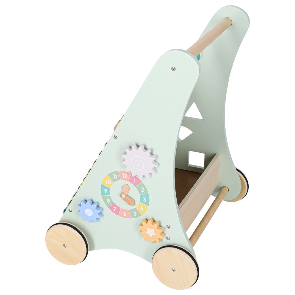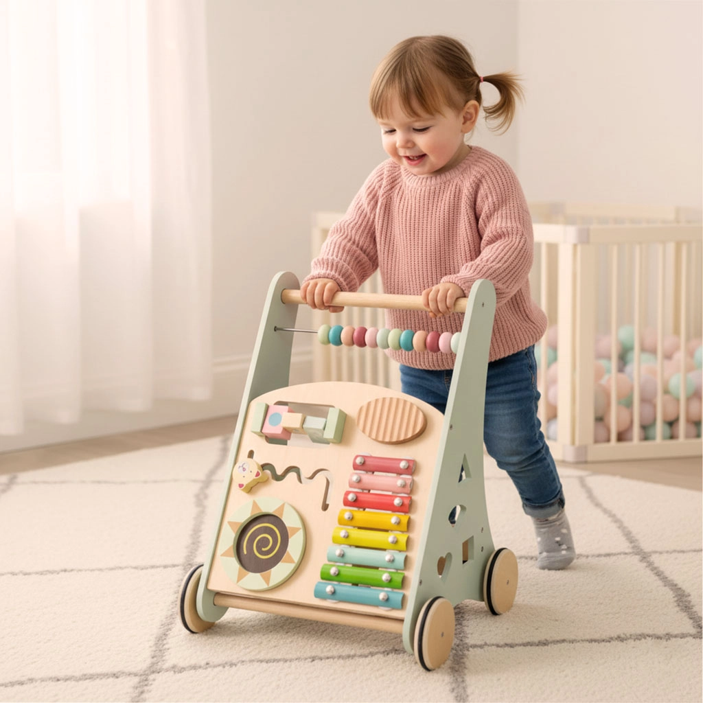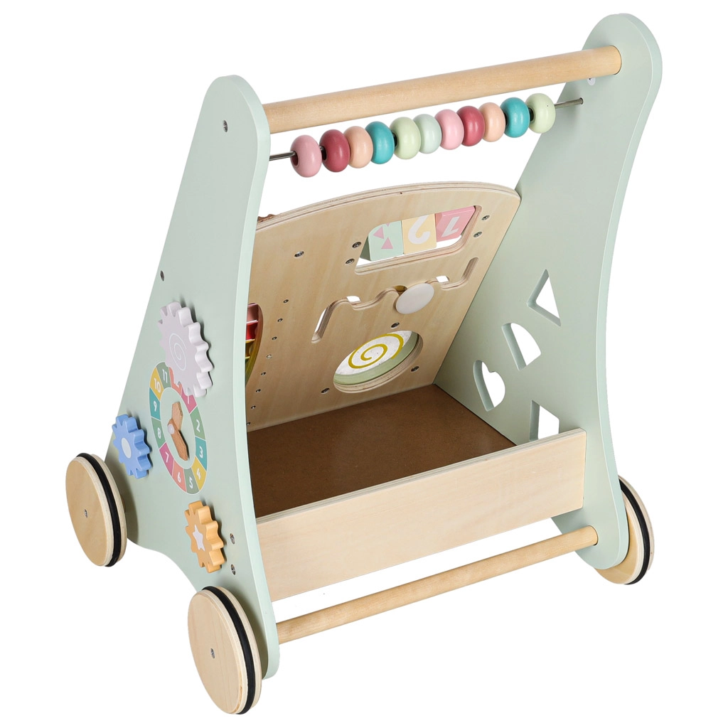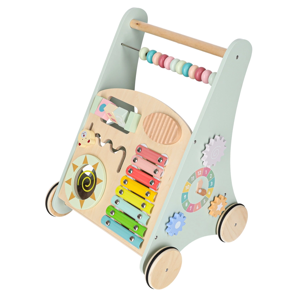 Het multifunctionele houten loopwagentje combineert ondersteuning bij de eerste stapjes met een speels activiteitencentrum. Het kind traint balans, oog-handcoördinatie en fijne motoriek door te duwen, draaien en vormen in te passen. Zachte pasteltinten en glad afgewerkt hout nodigen uit tot ontdekken, terwijl de xylofoon ritme en muzikaal gehoor stimuleert.