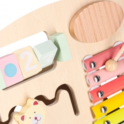De ingebouwde xylofoon met 2 houten stokjes ontwikkelt gehoor, ritme en coördinatie; kleurrijke elementen stimuleren zicht en tast.