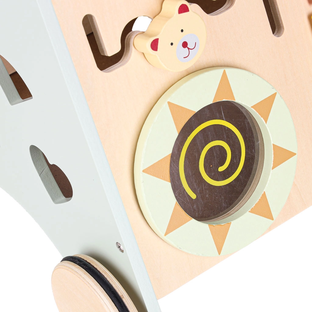 Op het frontpaneel vind je een xylofoon met stokjes, een telraam voor de eerste stapjes in rekenen en een vormenstoof om kleuren en vormen te leren. Tandwielen, een kralenlabyrint en een klok ontwikkelen logisch denken en begrip van oorzaak en gevolg. De rubberen wielbanden zorgen voor betere grip en een stille rit.