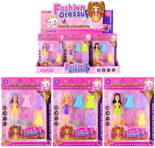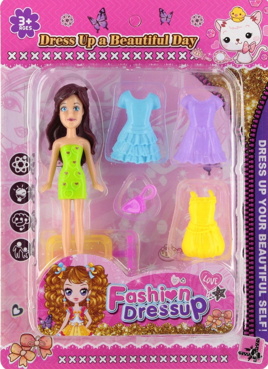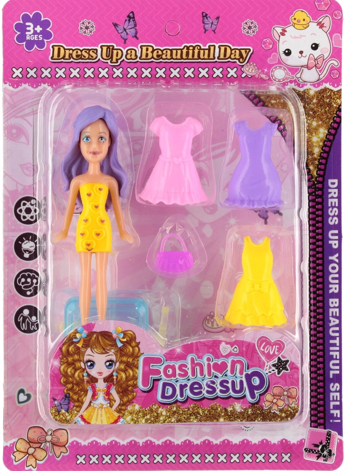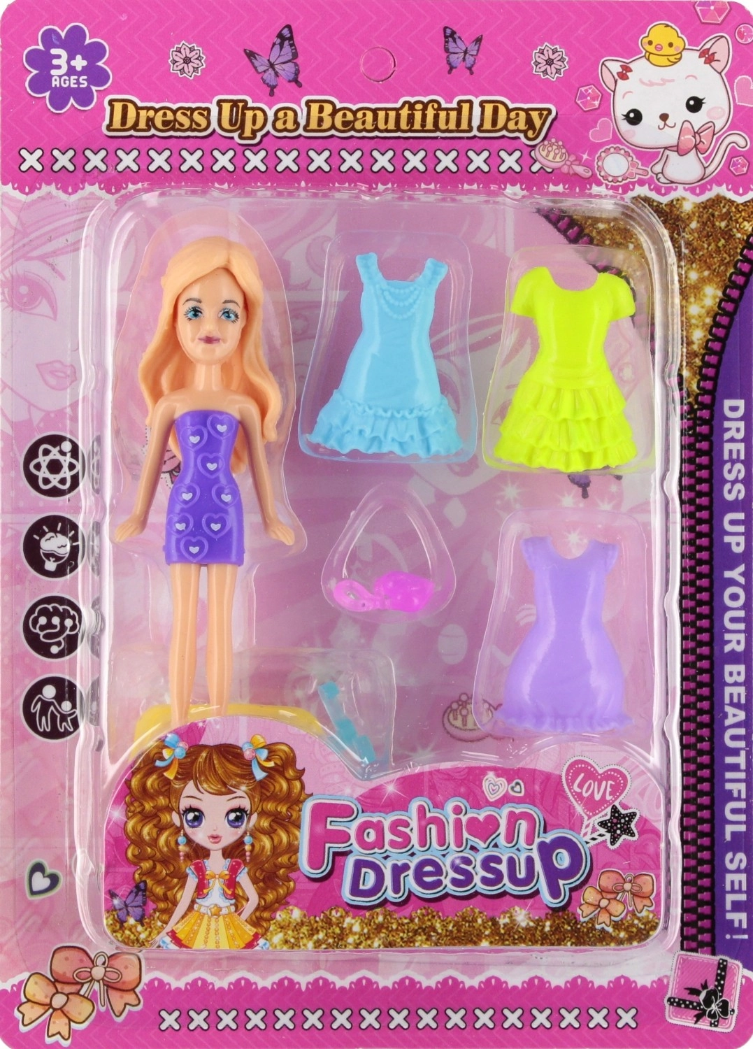 Een schattige aankleedpop met accessoires brengt kinderen veel plezier en creativiteit. Bevat drie verschillende jurken en een handtas, zodat kinderen hun eigen modieuze combinaties kunnen maken. Een geweldige speelgoedset voor kleine stylisten die van de wereld van mode en poppen houden. Mix van kleurvarianten. Geschikt voor kinderen vanaf 3 jaar. Prijs per stuk.