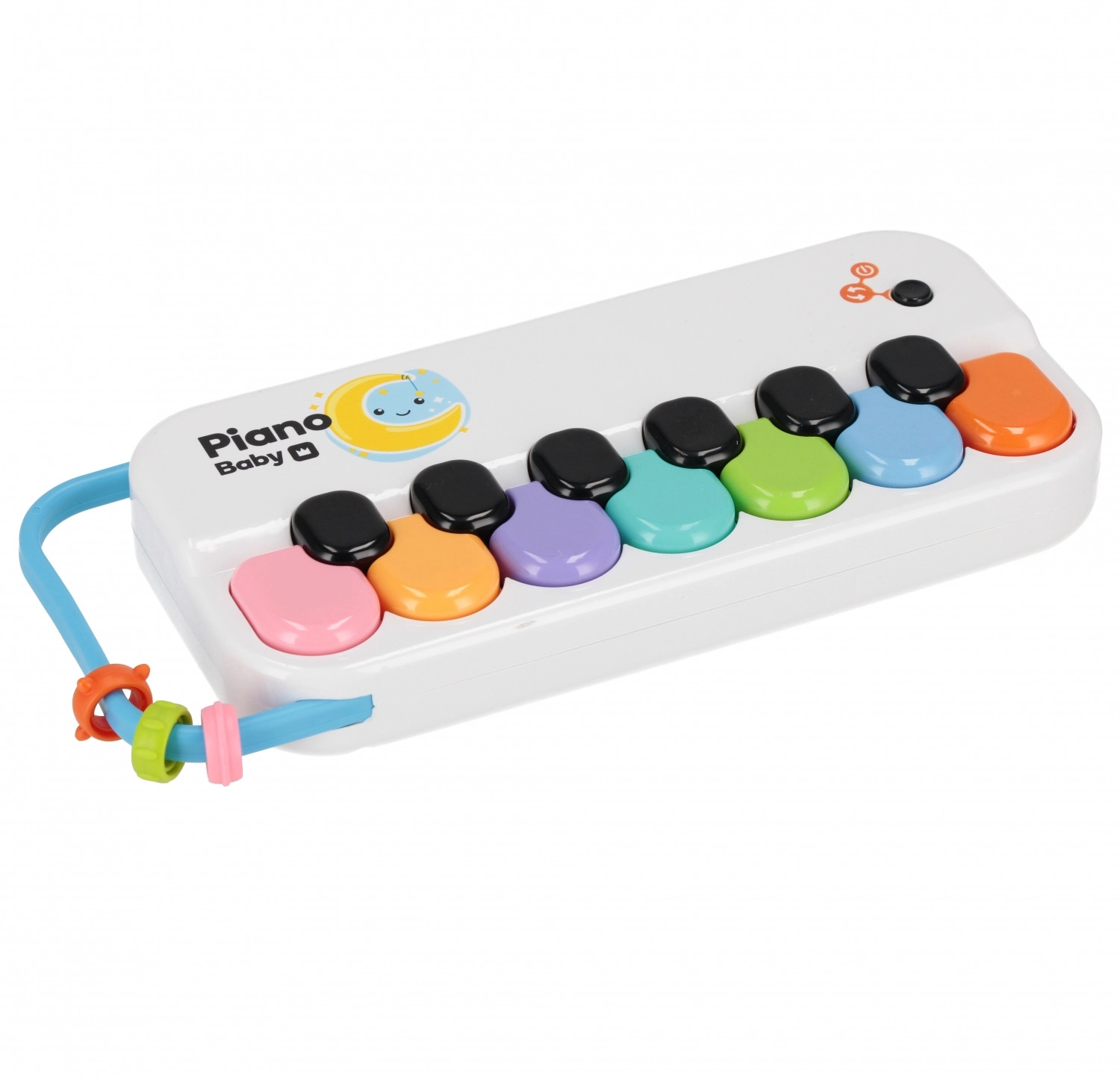 Acht pastelkleurige toetsen met halve tonen stimuleren de visuele aandacht en leren kinderen spelenderwijs tonen en ritme onderscheiden.