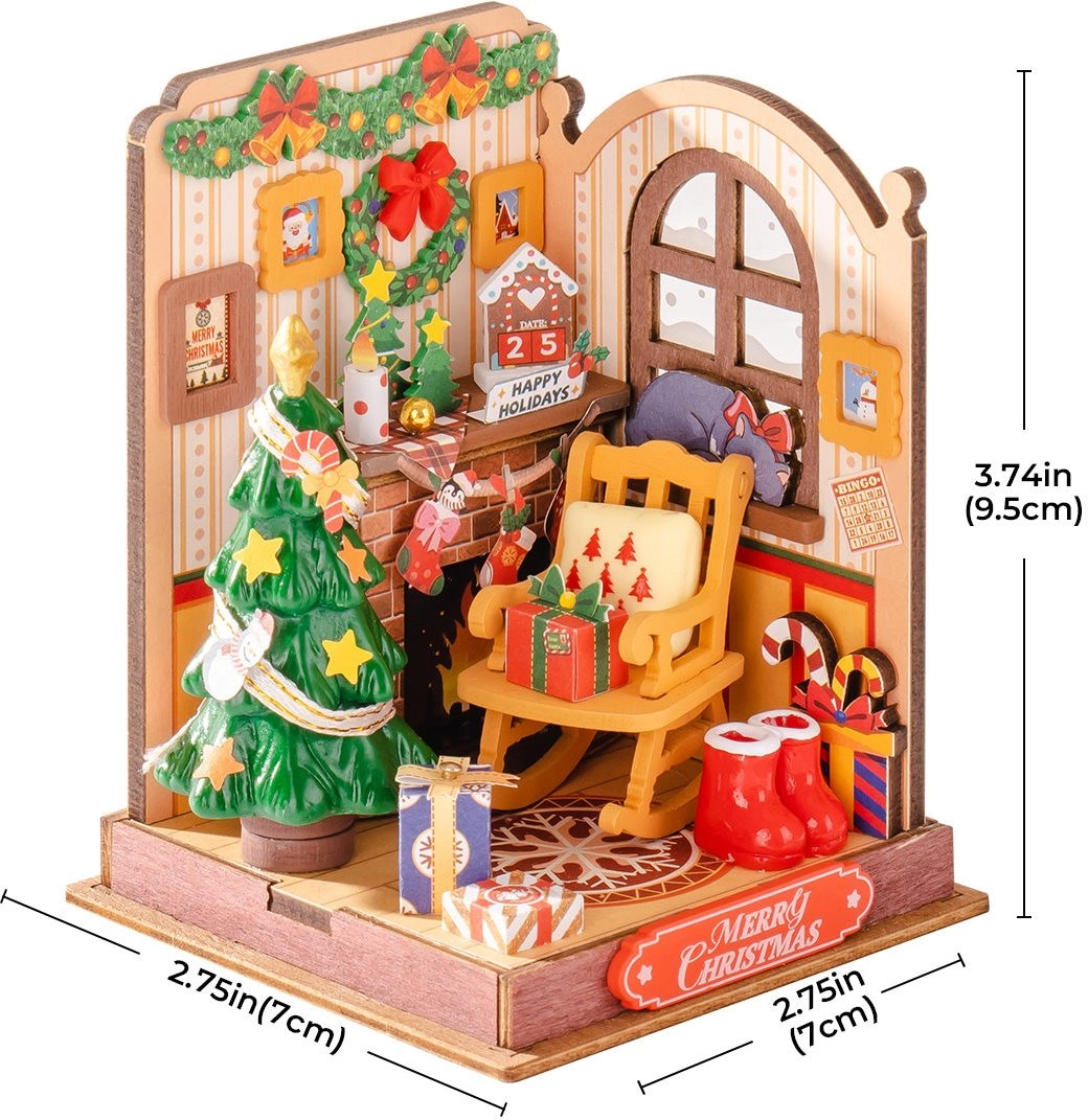Deze gedetailleerde DIY-set brengt de charme van Kerst in elk interieur. Boven de haard hangt een kalender met 25 december, overal fonkelen slingers en een krans, er brandt een kaars en onder de boom wachten cadeautjes. De scène wordt aangevuld met een schommelstoel voor opa, foto’s aan de muren, zoetigheden en een kat die bij het raam ligt te rusten.