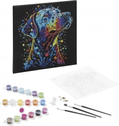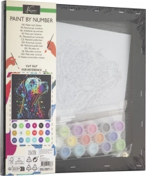 Inhoud van de set: 1× canvas met voorbedrukt motief, set acrylverven, 1× penseel, gedrukte handleiding.
