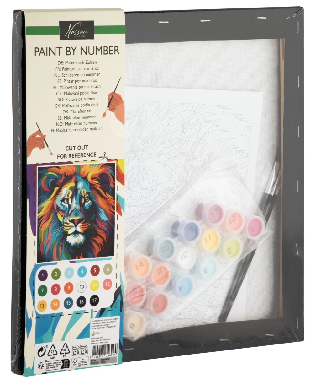 Deze creatieve set met een majestueuze leeuw op zwart canvas is een ideale keuze voor kinderen en volwassenen die willen creëren zonder ingewikkelde voorbereidingen. De contrasterende zwarte achtergrond laat de kleuren extra opvallen en het eindresultaat oogt als een echt kunstwerk. Volg eenvoudig de nummers en zie hoe het motief stap voor stap verandert in een voltooid schilderij.