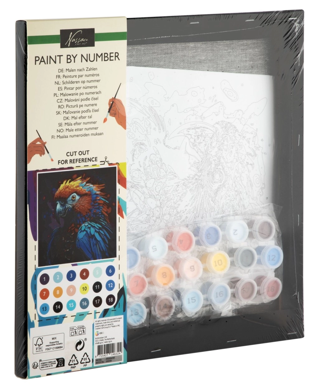 Ontdek de magie van schilderen op nummer en verander het voorgedrukte papegaaimotief op een zwarte achtergrond in een expressief schilderij met briljante kleuren. De genummerde delen komen overeen met de verfkleuren in de set, waardoor het schilderen intuïtief is, ook voor beginners. Het zwarte doek geeft het motief diepte en een moderne uitstraling.