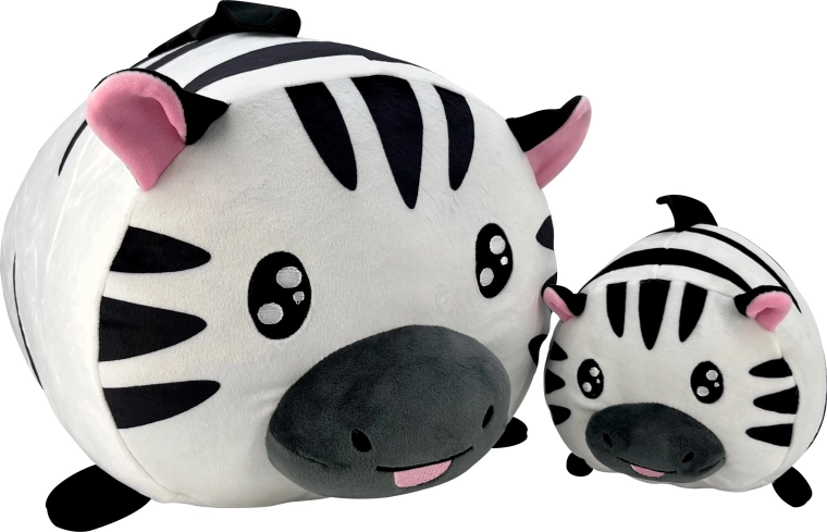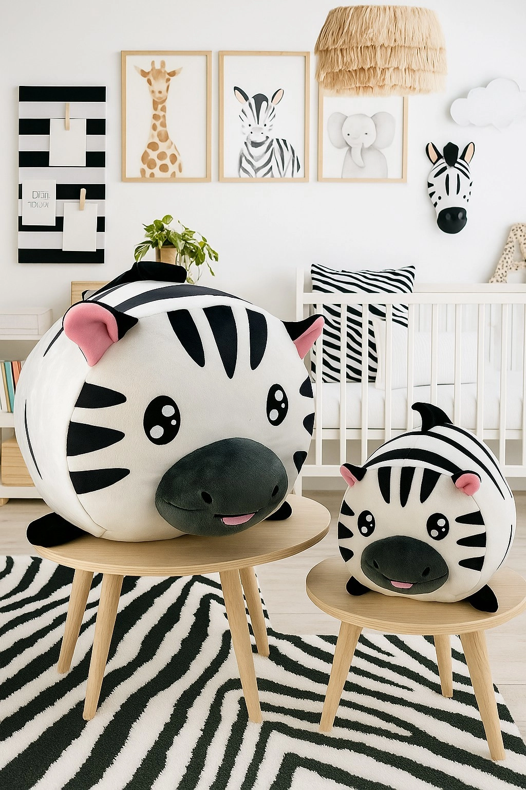 Schattige set van twee pluchen zebra’s – mama en jong – van extra zacht materiaal voor spelen, knuffelen en decoratie. De kleinere zebra is ideaal als eerste knuffel, de grotere dient als comfortabel kussentje voor onderweg of in de kamer. Dankzij de hoogwaardige afwerking, het veilige geborduurde gezicht en de mogelijkheid om in de wasmachine te wassen, biedt deze set comfort, veiligheid en lange levensduur.