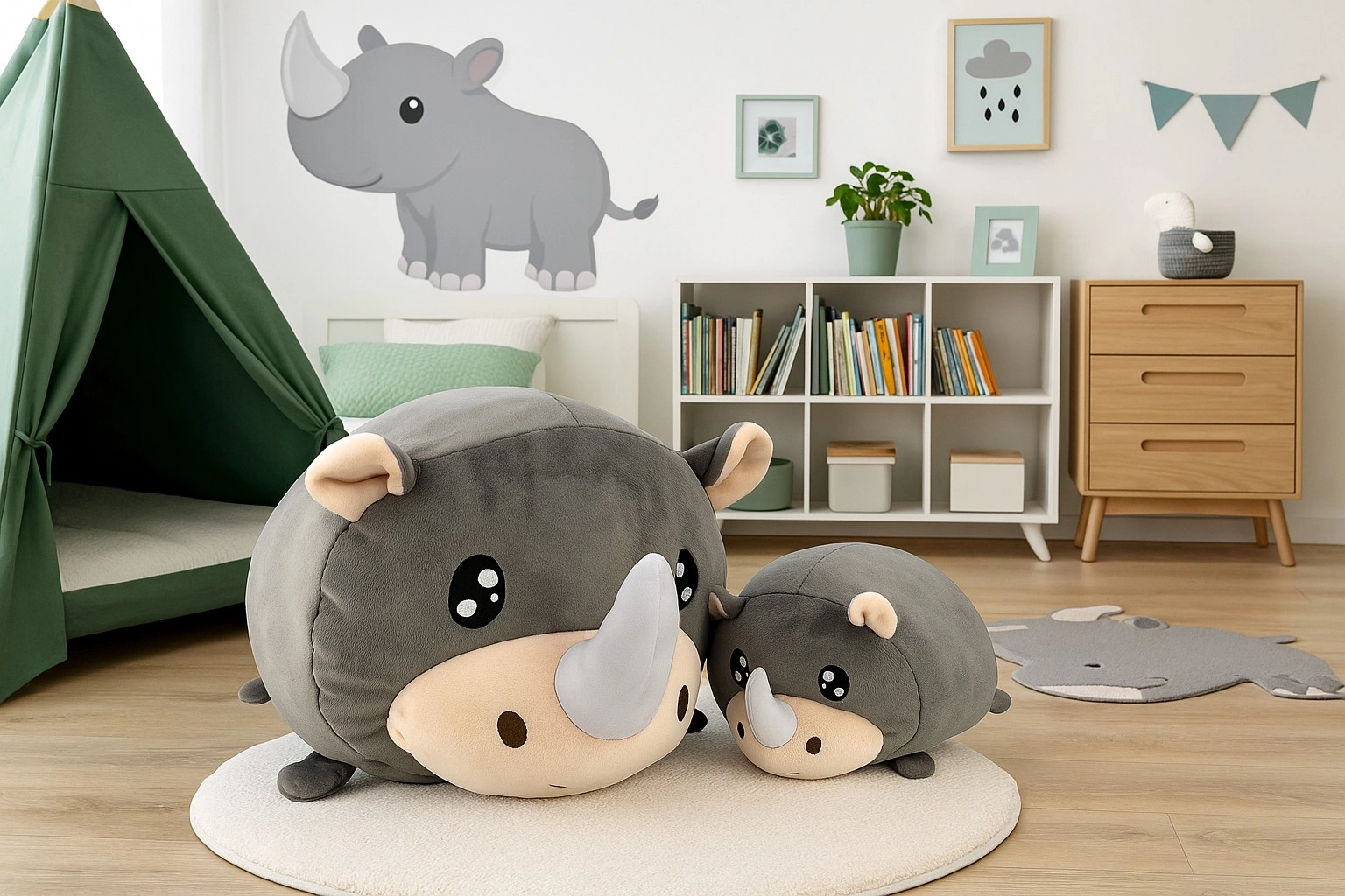 Een schattige set pluchen neushoorns – mama en jong – die kinderen vanaf de geboorte blij maakt. De speelgoedjes van extra zachte pluche zijn veilig, fluweelzacht en ideaal om mee te knuffelen, te spelen of als decoratie. De kleinere van 20 cm is een perfect knuffeltje voor de allerkleinsten, de grotere van 40 cm dient als kussentje voor onderweg. Zachte pluche, borduursels zonder harde onderdelen, wasbaar op 30 °C en geschikt vanaf 0 maanden.